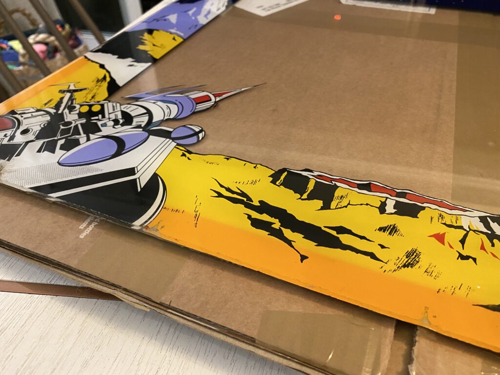 Levei bastante tempo para conseguir achar a solução. Como nos Estados Unidos a versão de Space Invaders mais comum é a da Midway, fabricada naquele país, é muito difícil conseguir um exemplar da Taito e, portanto, não há muitas alternativas para a restauração. Encontrei opções de impressão de adesivo, que por sua vez deveria ser aplicado em uma nova chapa de acrílico. Eu ainda estava resistente a este tipo de solução, por divergir muito da aplicação original.