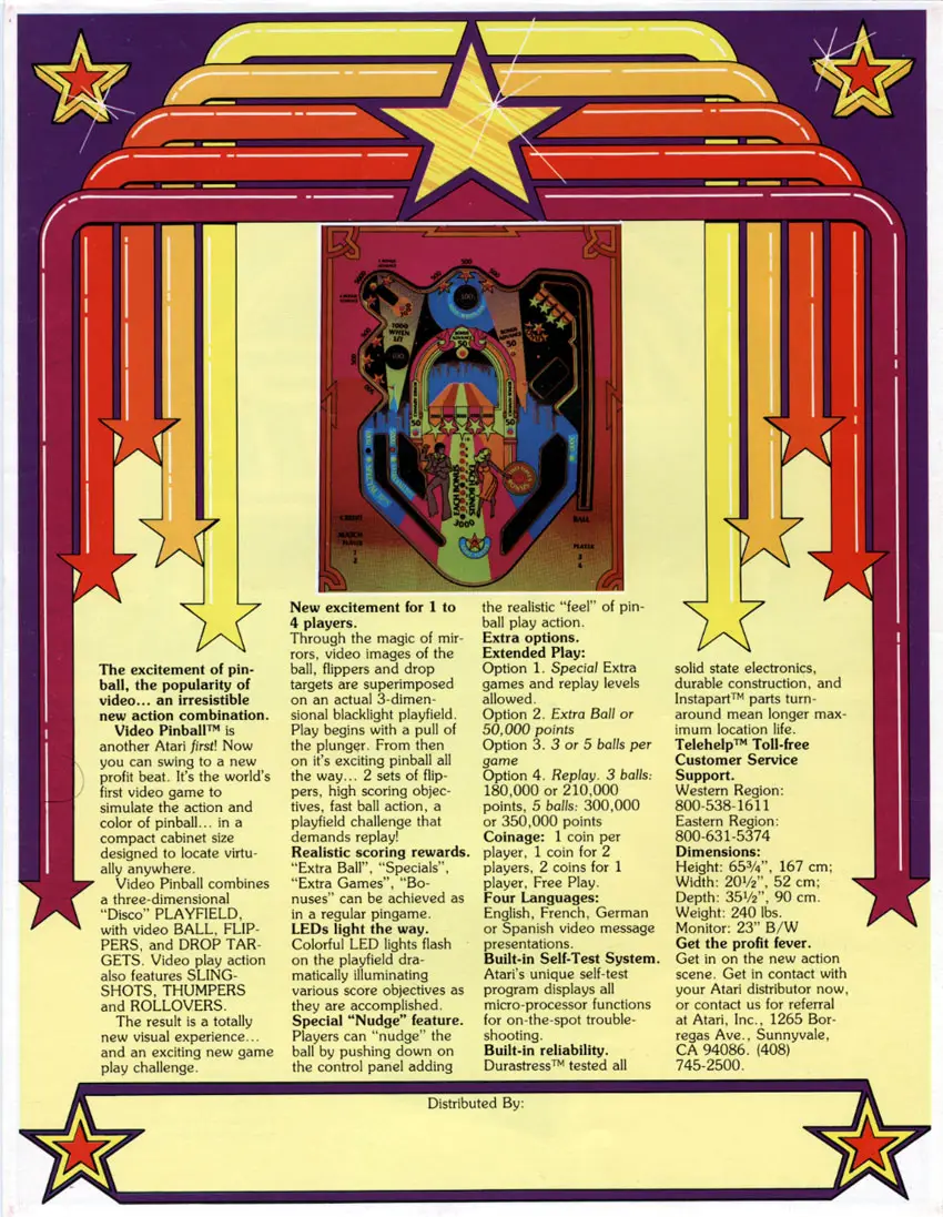 Uma das aparentes justificativas para a tentativa de lançar este jogo em formato eletrônico era o grande espaço ocupado pelos gabinetes de pinball, o que é indicado no flyer do Video Pinball da Atari da época: “compact gabinet size”. Porém, não existe nada de compacto no curioso formato do gabinete full size do Video Pinball: suas medidas são mais compridas do que um gabinete convencional devido à presença do monitor de 23 polegadas deitado na vertical, embora sua largura seja mais estreita.