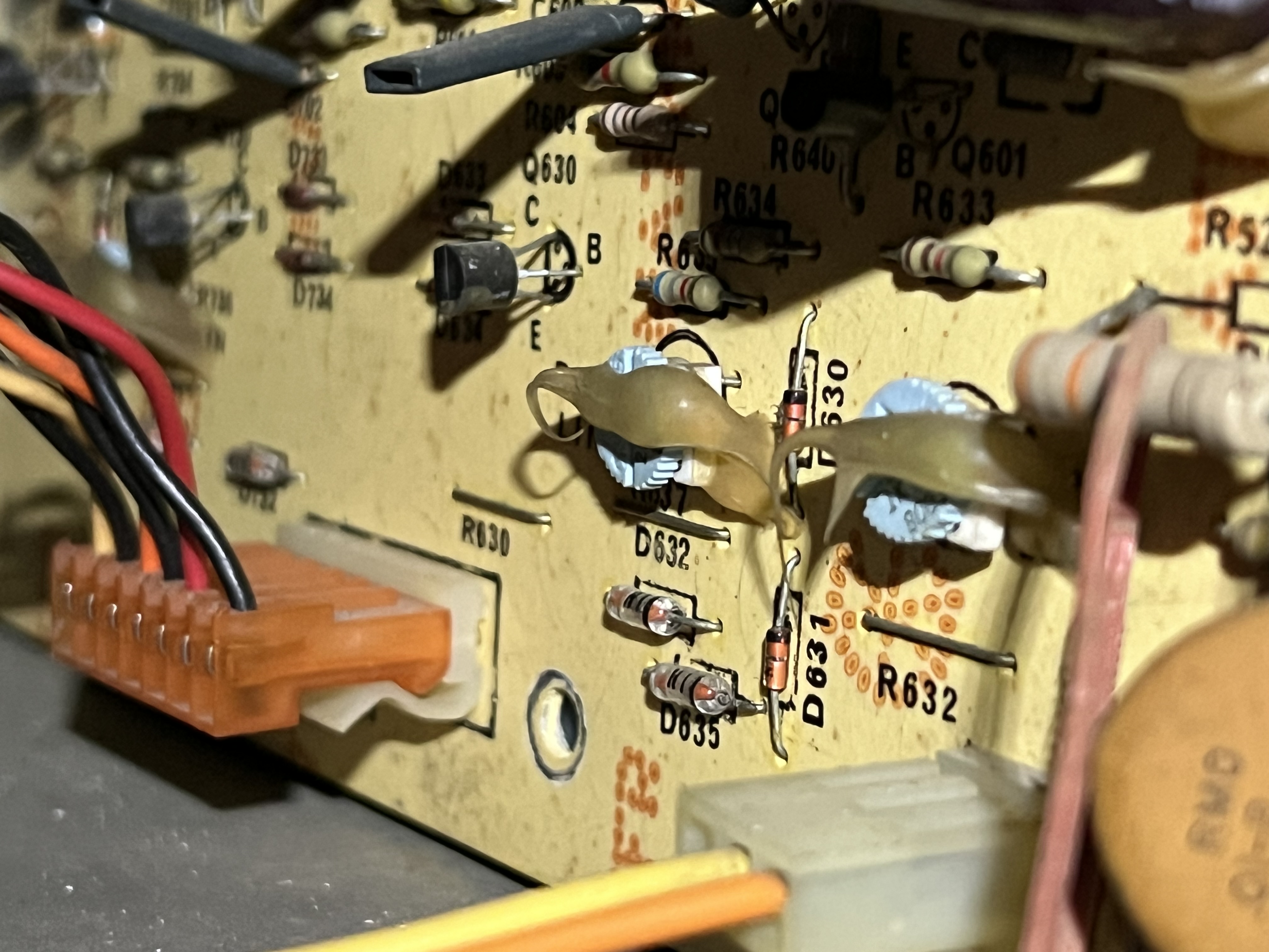 A sequência de reparo, no meu caso, envolveu retirar pedaços de silicone que preservavam a posição original dos trimpots e realizar a tentativa do passo 1 acima, ou seja, mudar os trimpots ligeiramente de posição. Após alguns dias de testes, o problema persistia.