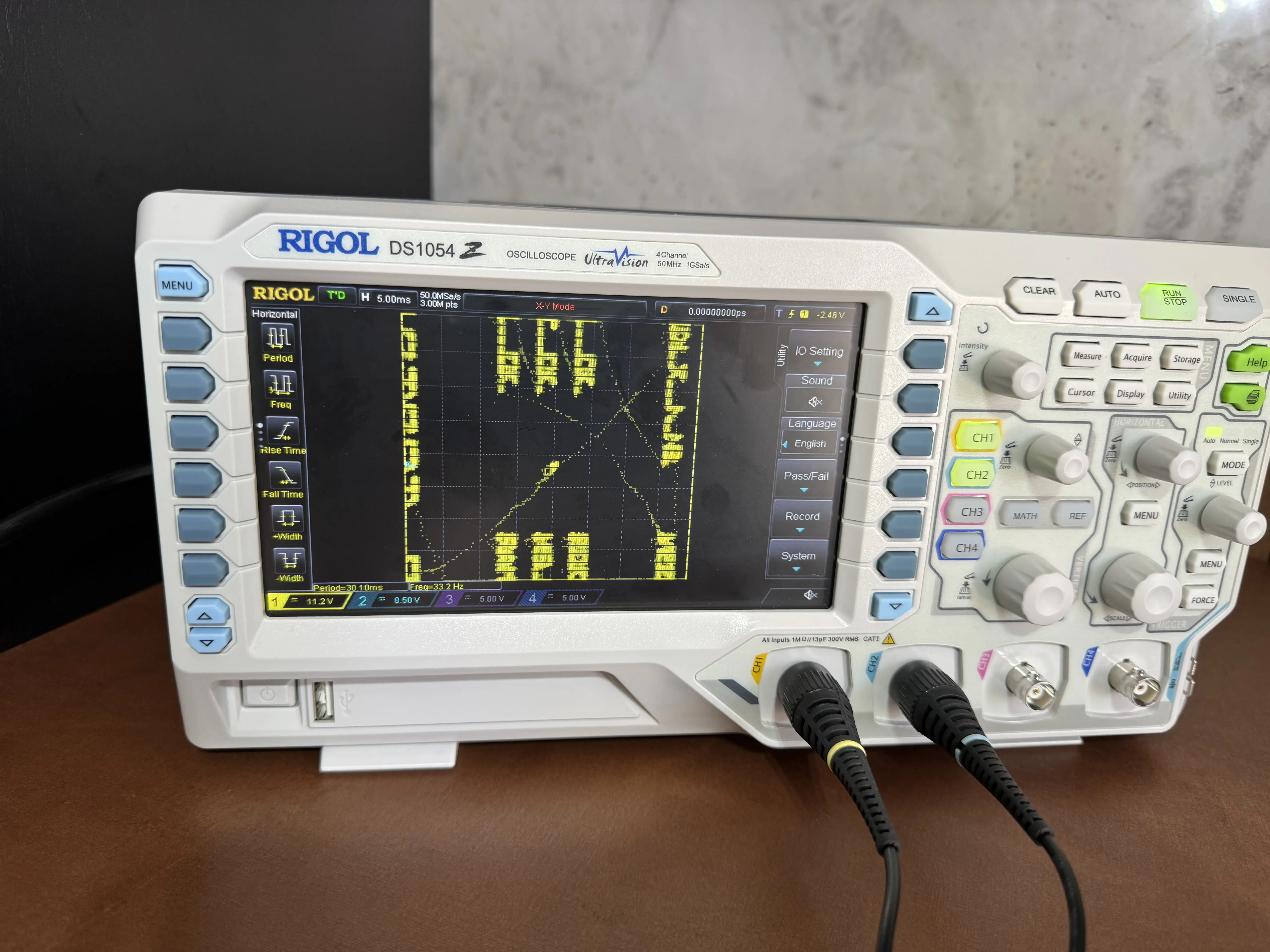 Alguns dias depois, eu segui o procedimento básico de diagnóstico de vídeo, primeiro ligando o osciloscópio diretamente nas saídas XY da PCB, e comprovei que a placa estava funcionando:
