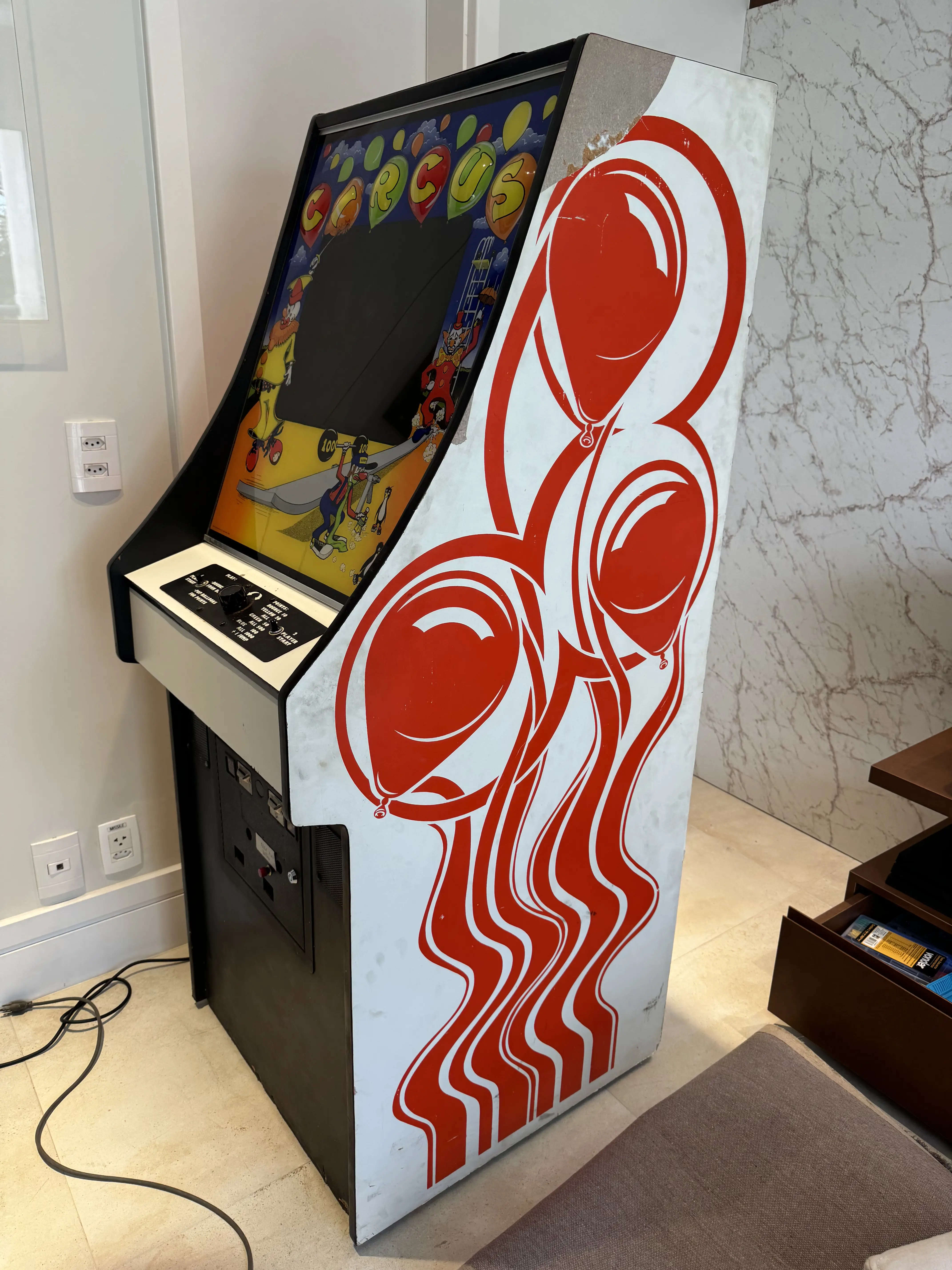 Ao receber no Brasil o arcade game Circus, da Exidy, logo na inspeção percebi um importante defeito na lateral direita: uma parte do adesivo estava faltando. Em teoria, a side art do Circus deveria ser feita com stencil (grafiti), porém o meu exemplar já estava adesivado, levando a crer que teria sido restaurado previamente.