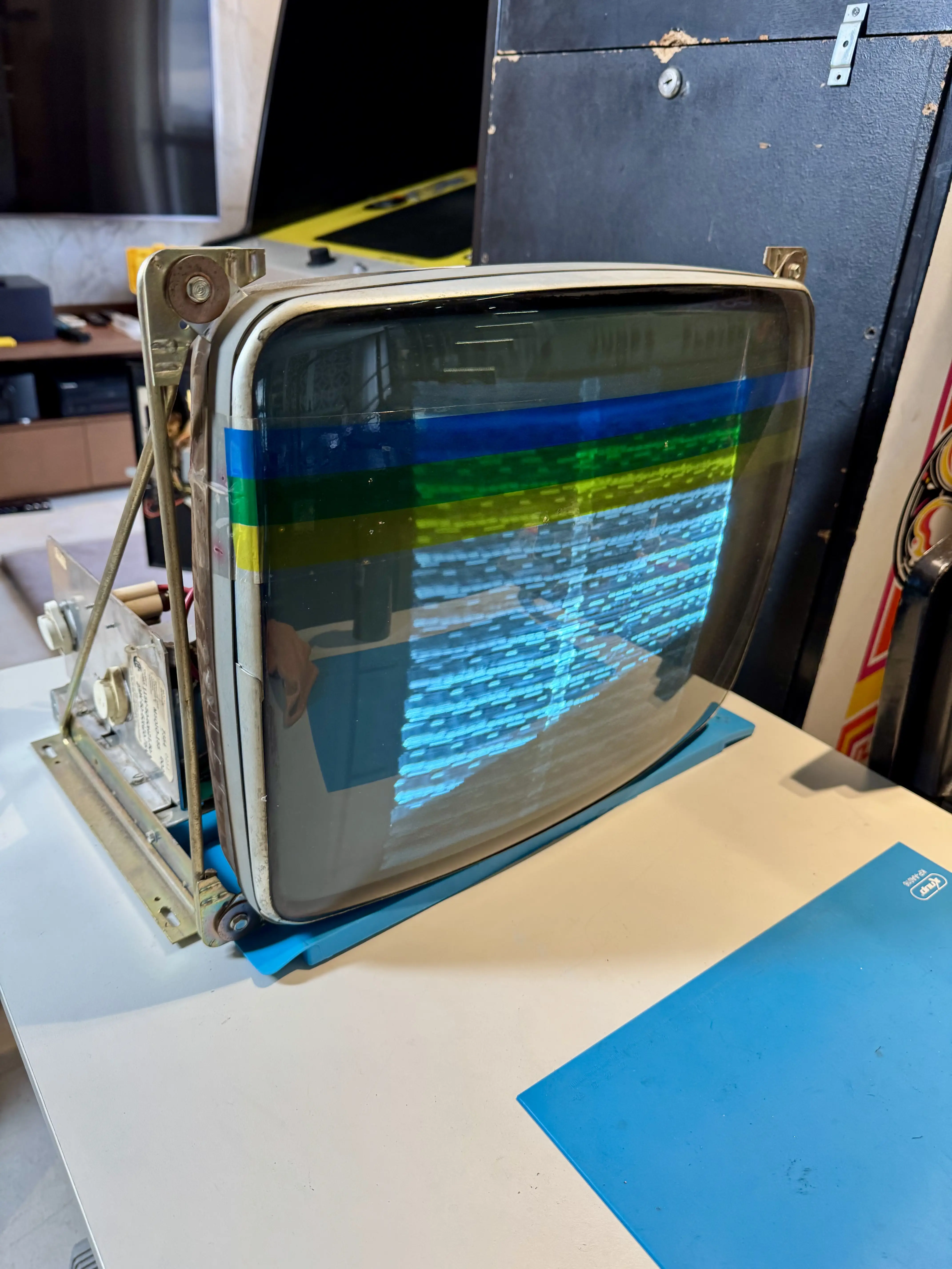 Sempre acho interessante entender como cada fabricante solucionava a questão das cores na Era de Bronze dos Video Arcades. Diferentes formas de lidar com isso variam desde a aplicação de gels diretamente sobre o tubo até overlays sobrepostos ao monitor. No caso do Circus, finas camadas de celofane ou filme tipo gelatina foram aplicados em uma máscara transparente, que segura o conjunto sobre o tubo: