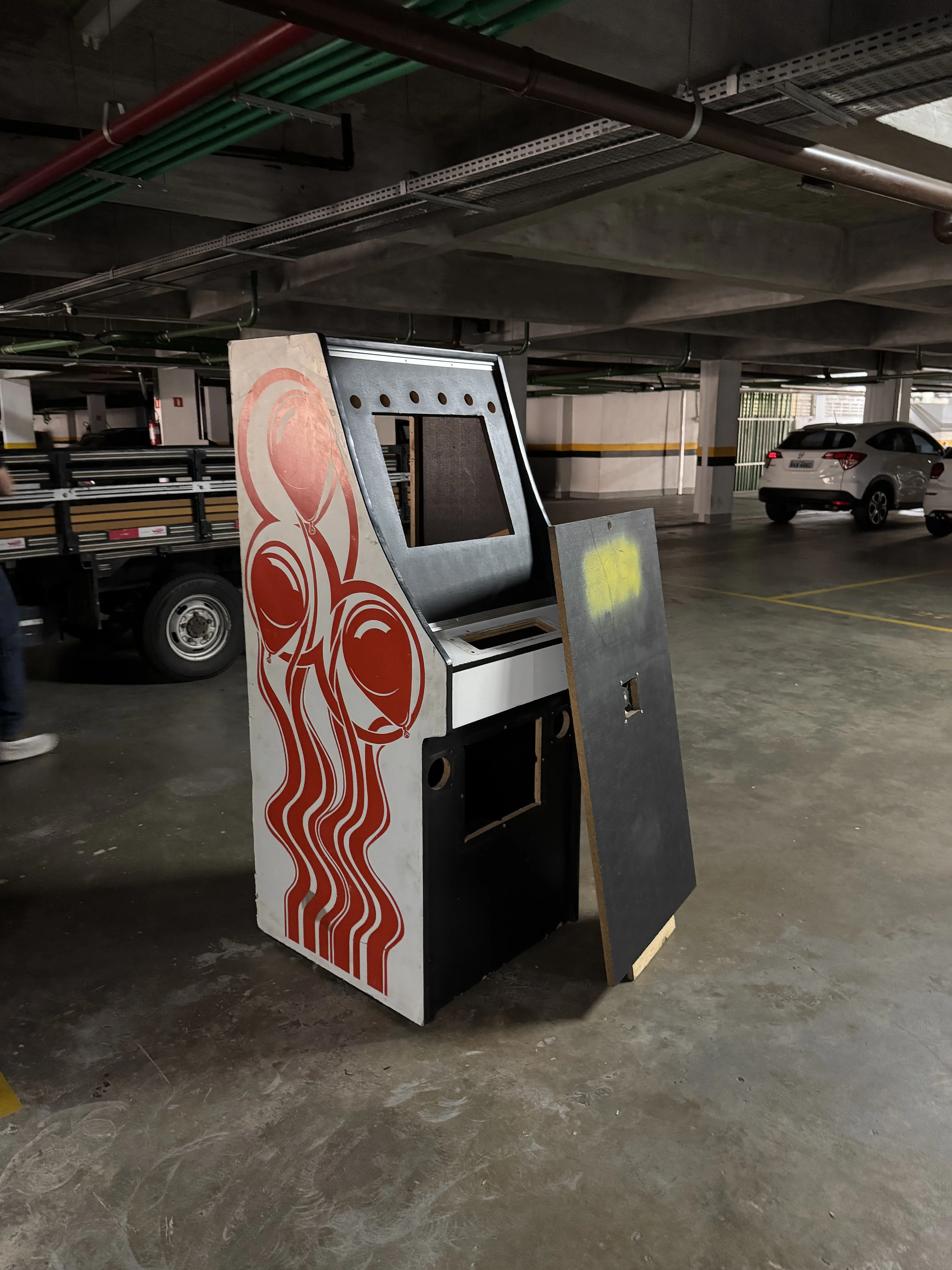 Tomada a decisão de restaurar o gabinete para aplicação dos adesivos da side art, iniciei o processo de desmontagem de todos os componentes. Comecei pelo painel de controle, o qual, diferentemente de outros arcades, é parafusado por fora e ainda possui presilhas do tipo borboleta pelo lado de dentro.