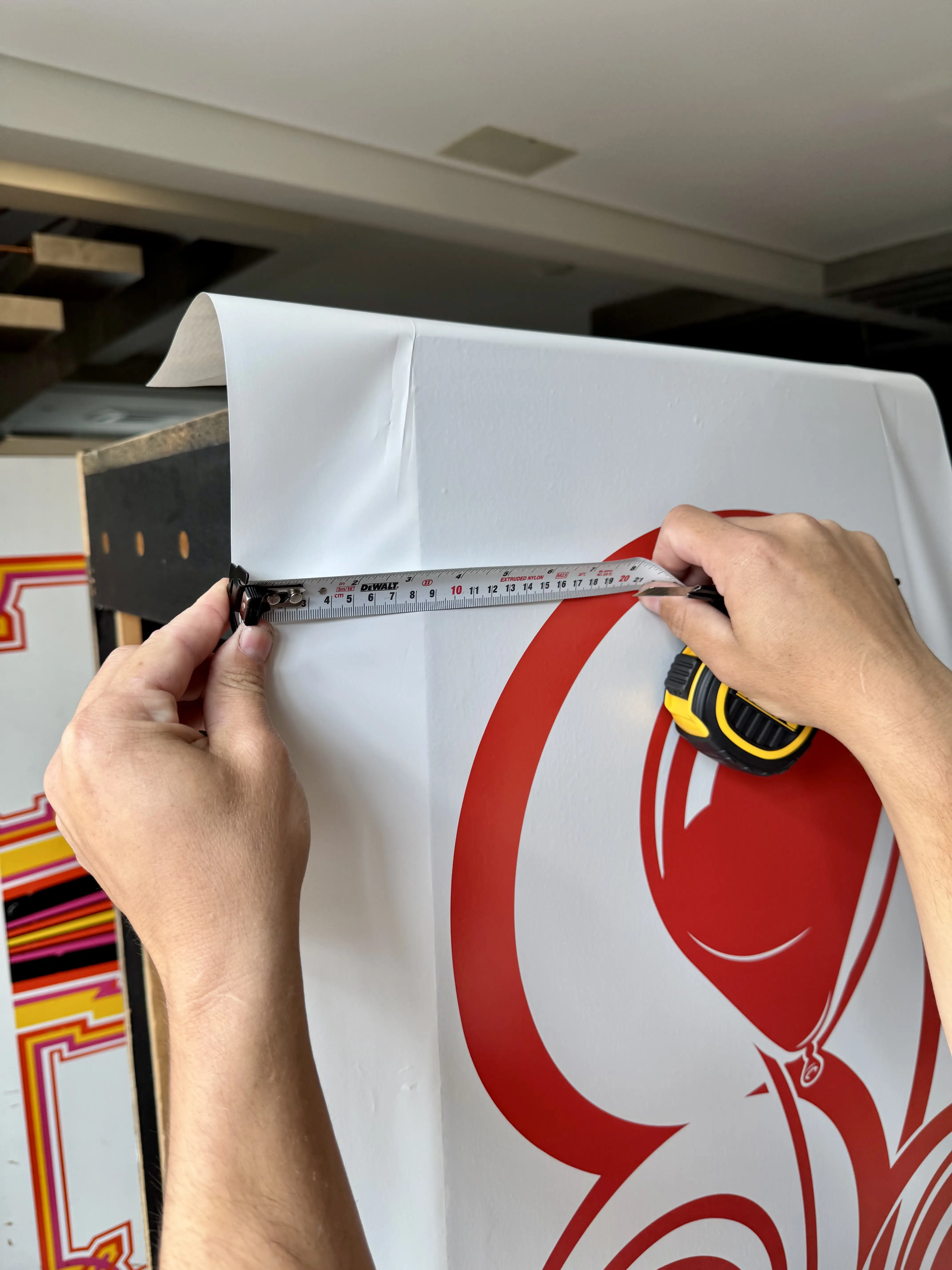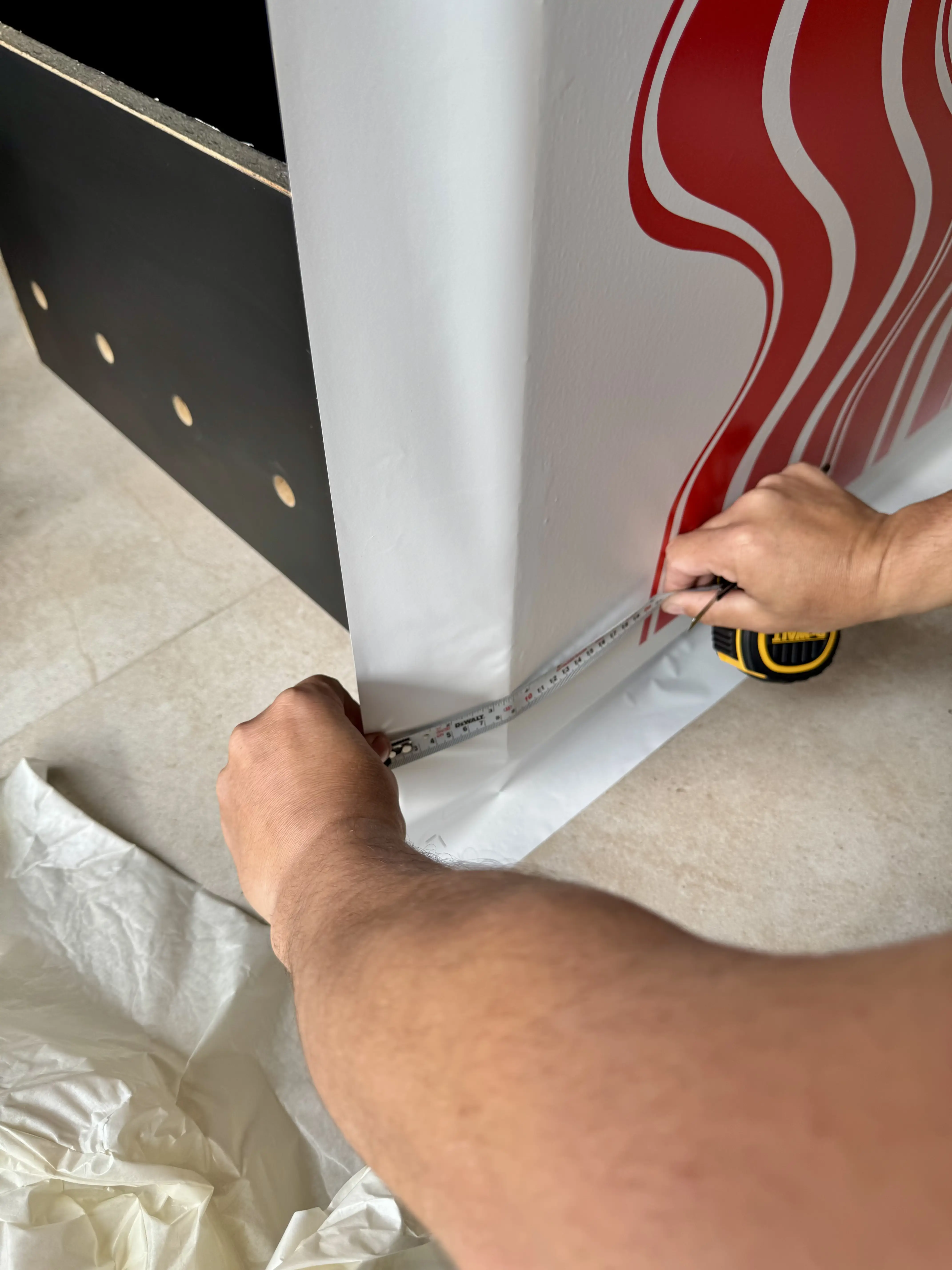 Ao longo da aplicação, fomos conferindo as medidas tiradas do adesivo original, para ter certeza de que estávamos mantendo a nova arte reta e no local certo do gabinete.