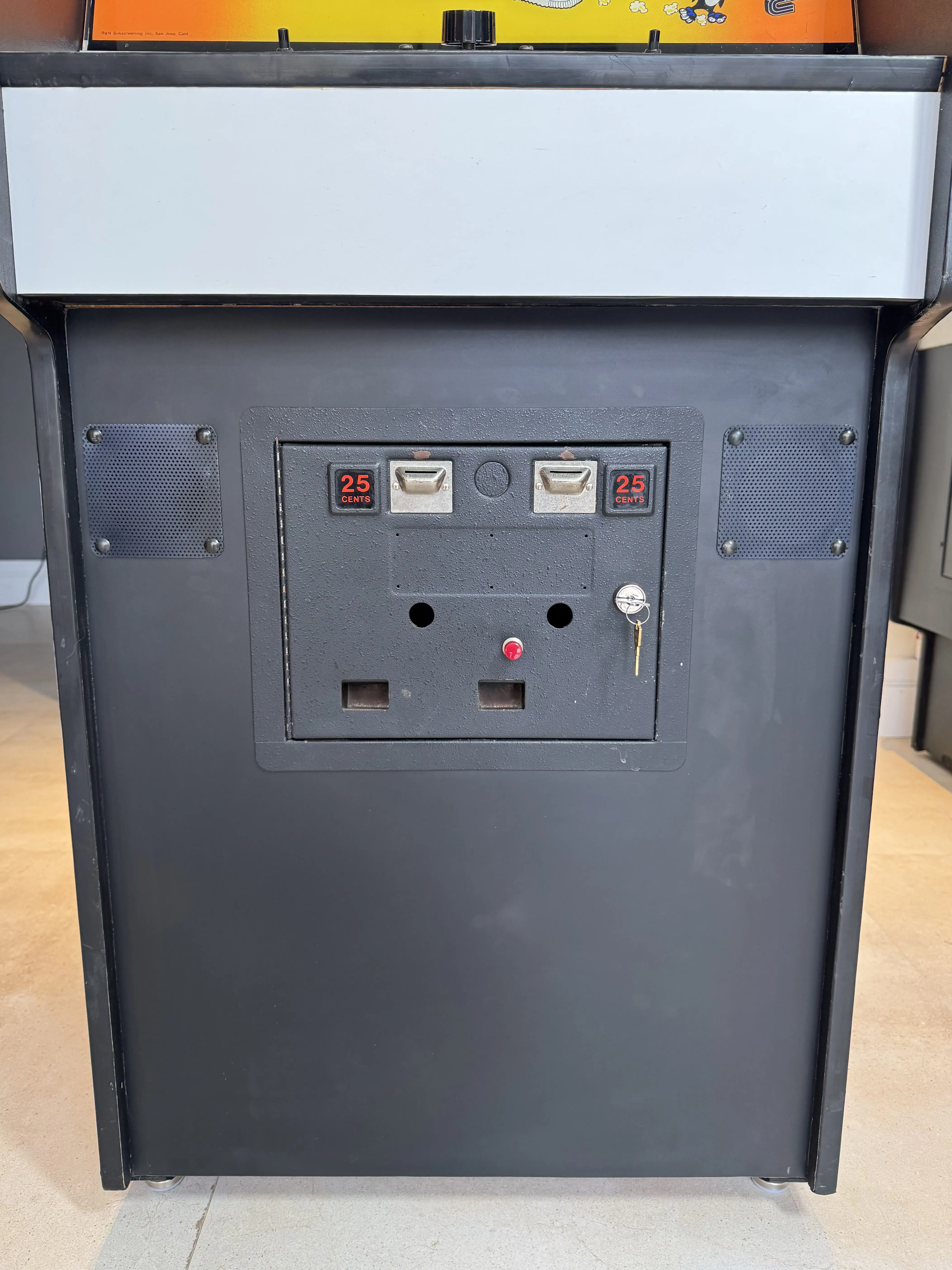 É fascinante ver esta máquina de arcade Circus ligada e funcionando após 50 anos. Seu belo tema circense, representado desde a lateral até o marquee iluminado, com luzes piscando, complementa bem o jogo old school. É um verdadeiro clássico em preto e branco com overlays coloridos justapostos formando as faixas amarela, verde e azul das diferentes zonas de pontuação do jogo.