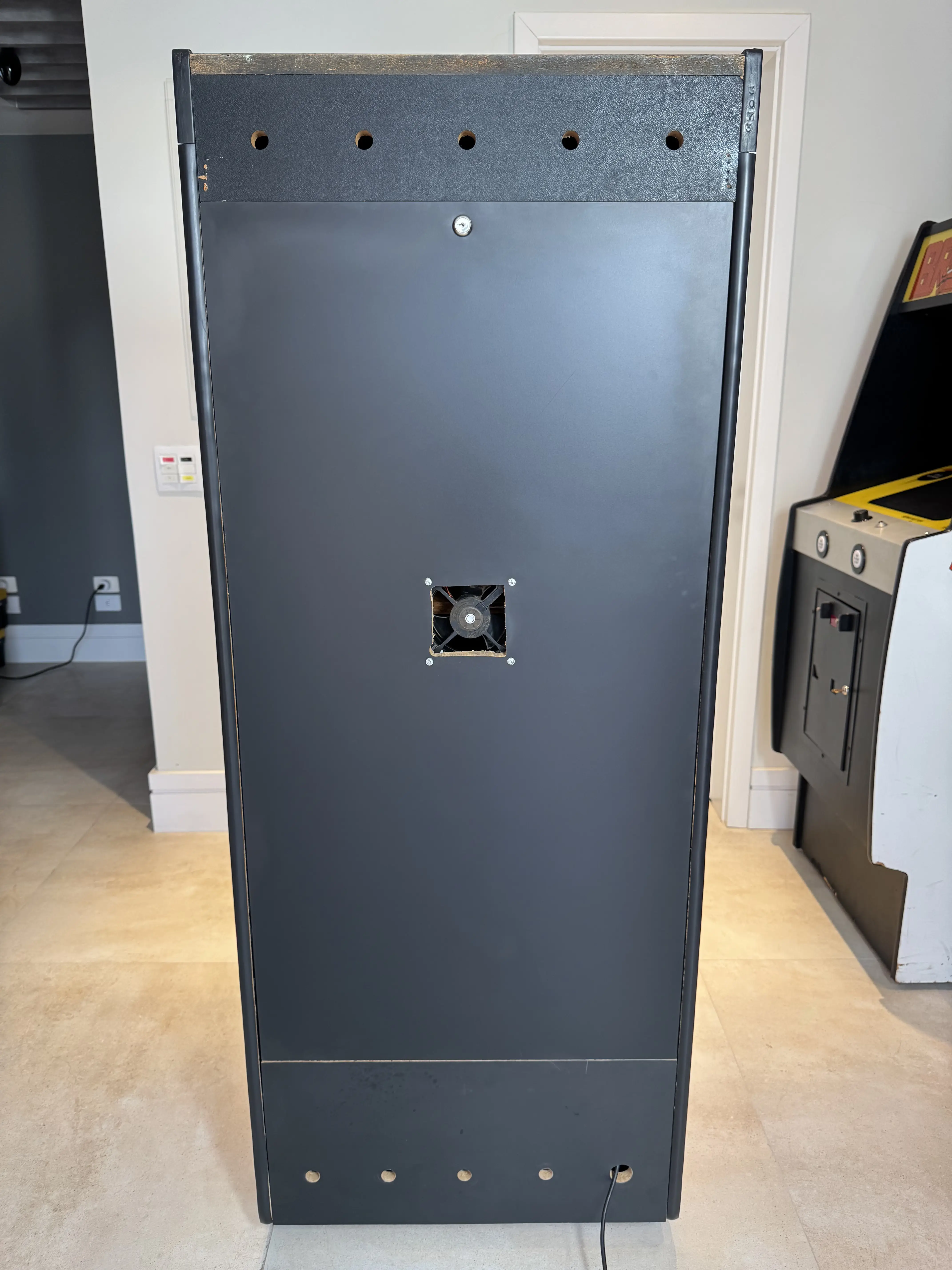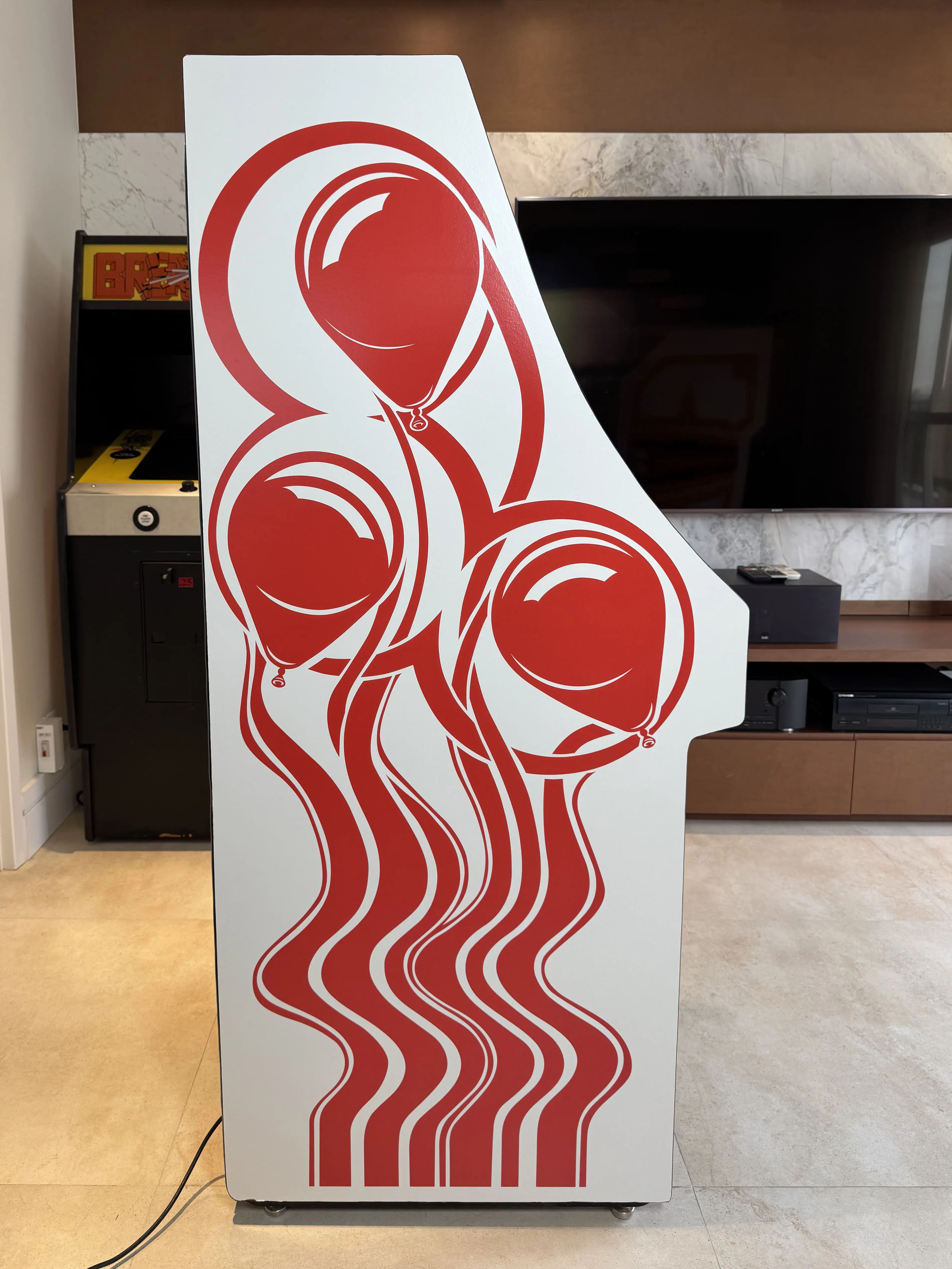 O gabinete foi restaurado em marcenaria, com aplicação de novas fórmicas e ajuste de todas as chapas internas de madeira, além da aplicação de selante nas chapas de aglomerado. A lateral, depois de restaurada, recebeu novos adesivos adquiridos na This Old Game, que replicam a cor exata do gabinete original.