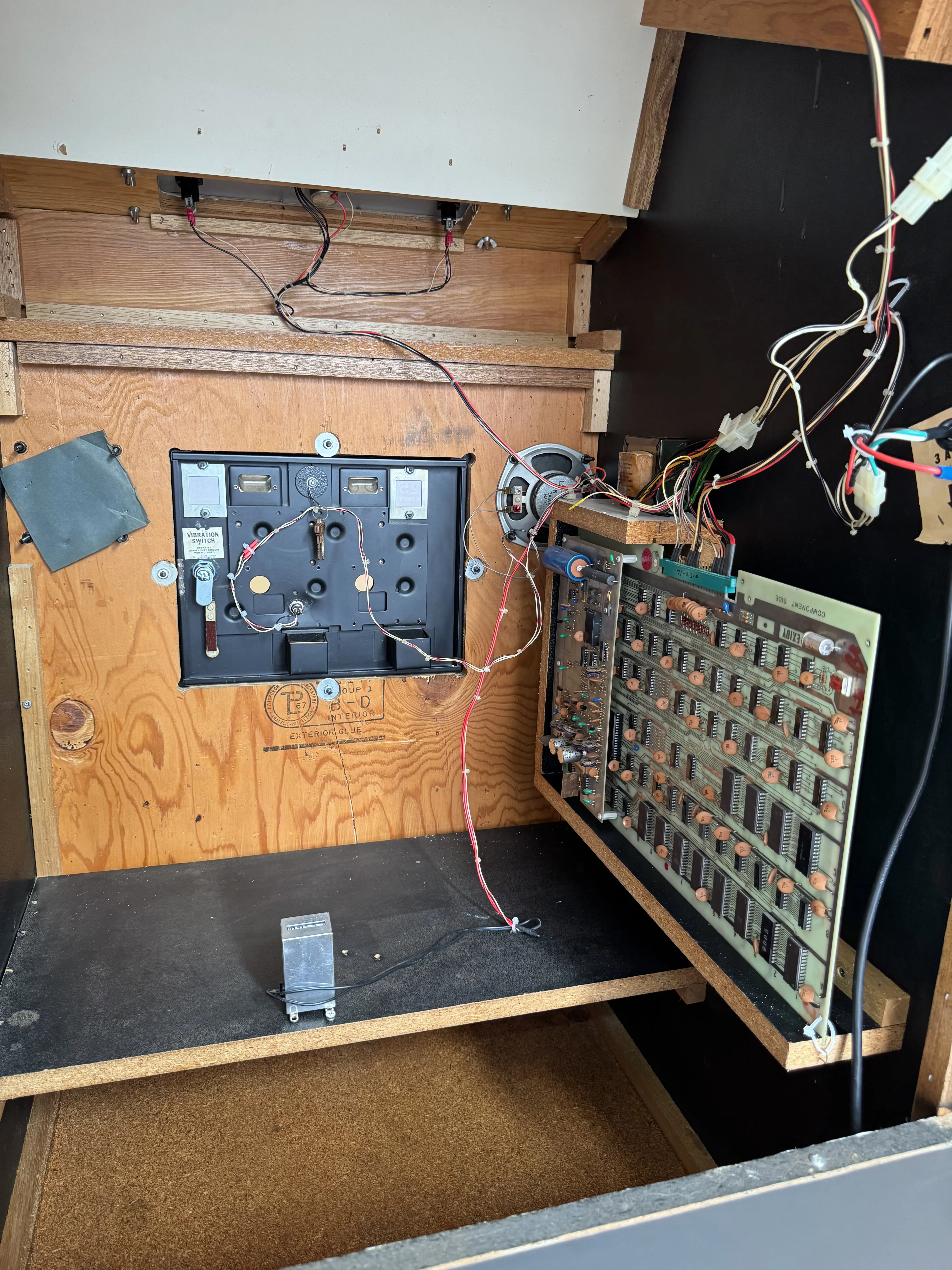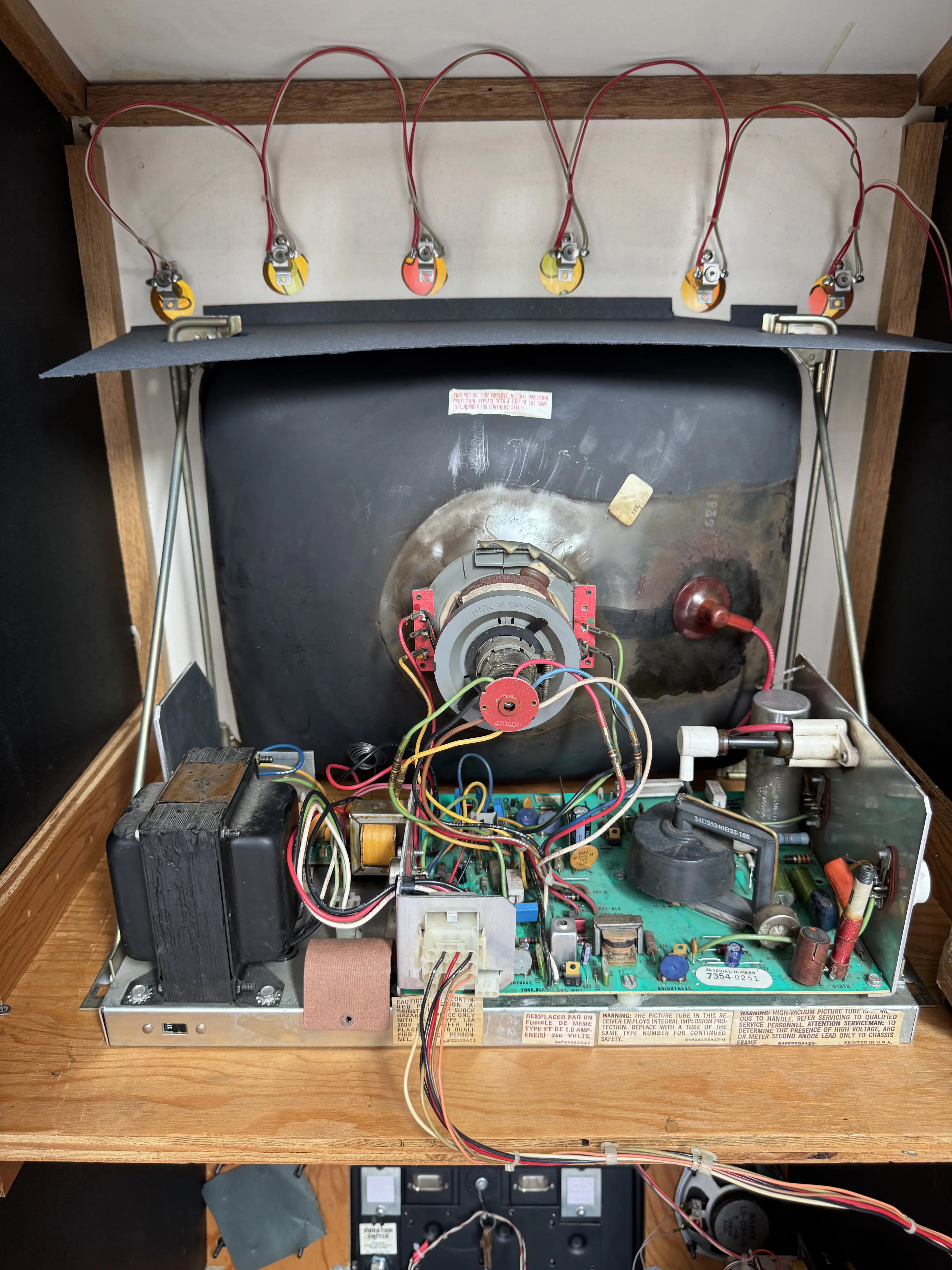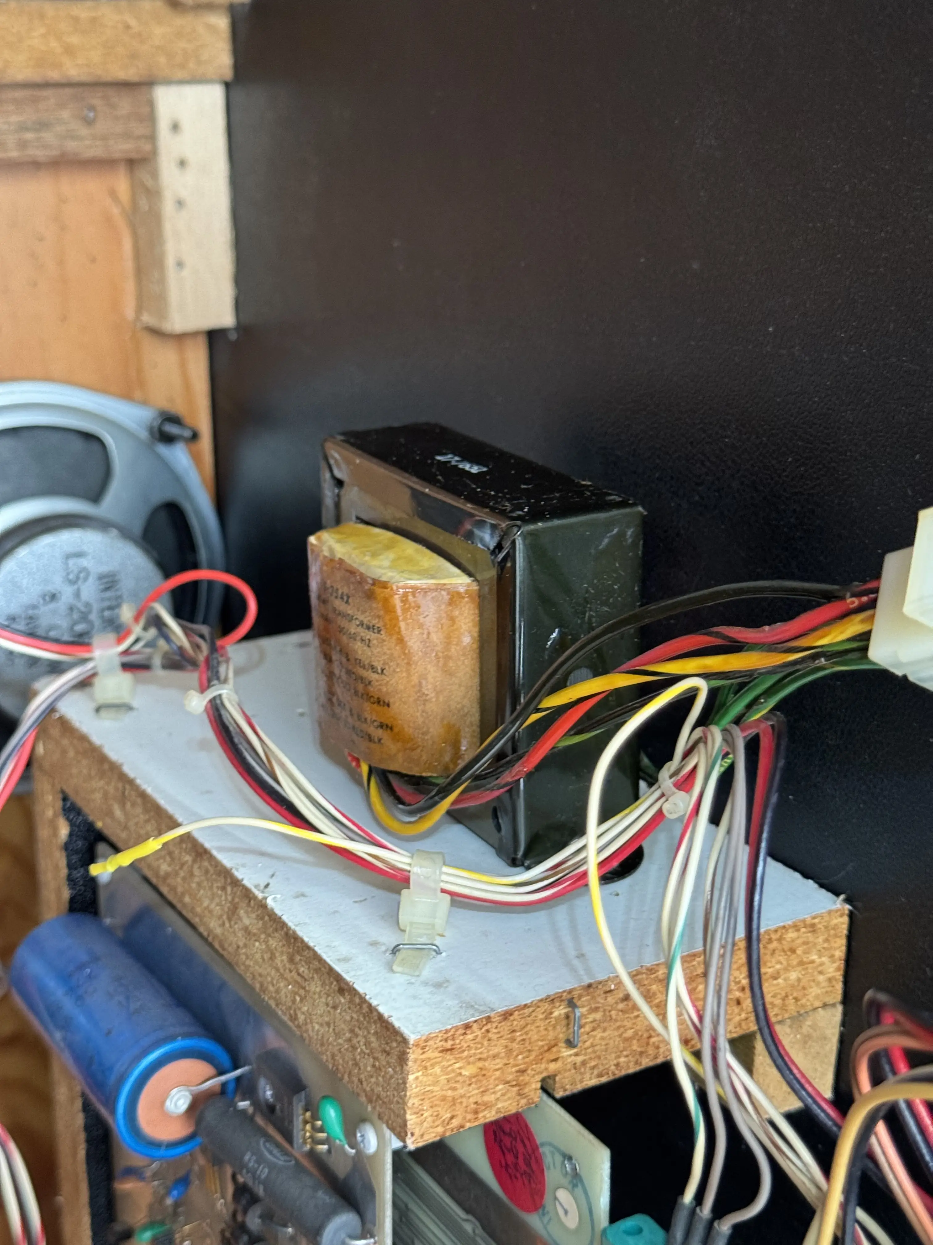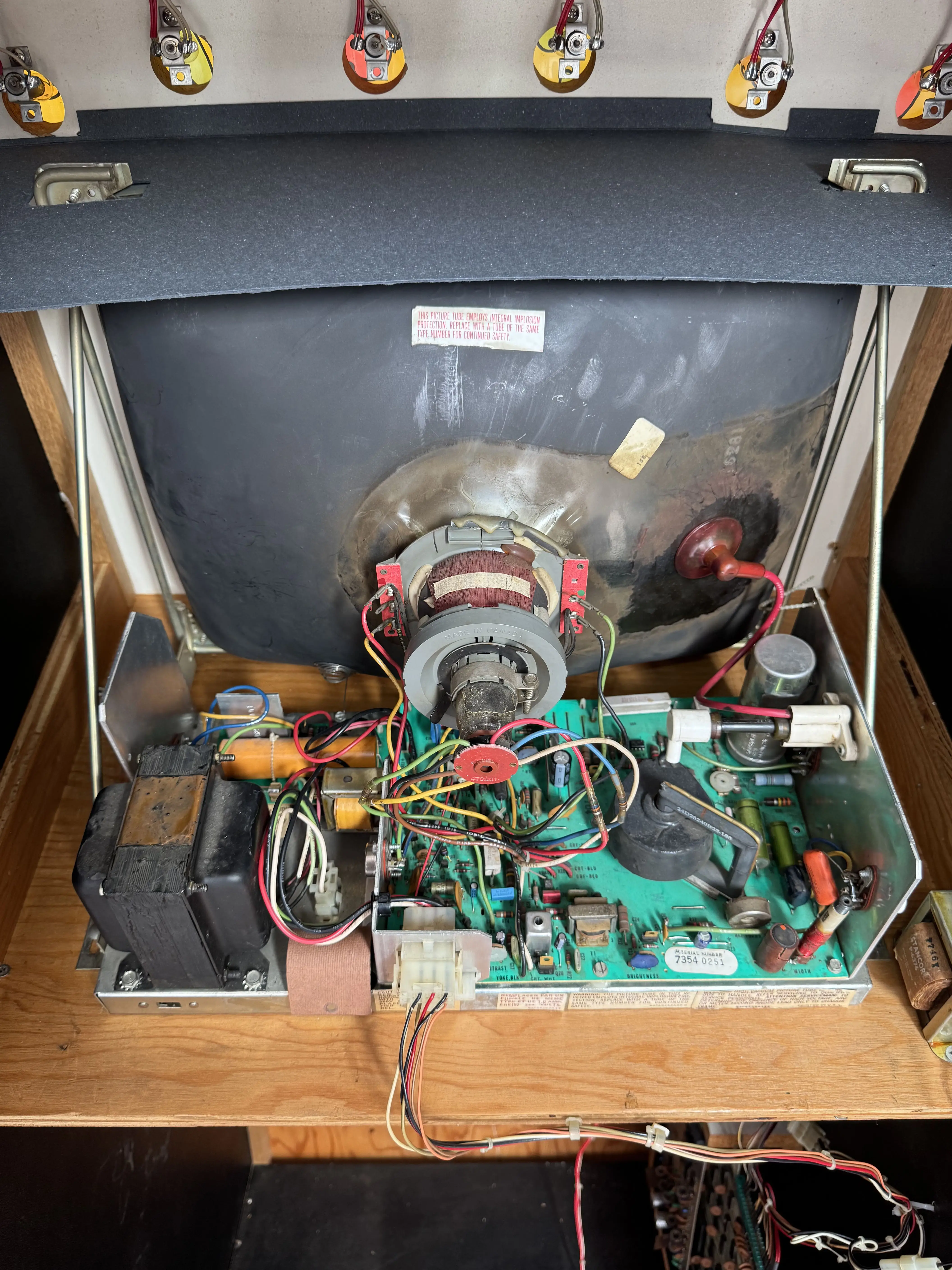 Internamente, a eletrônica está em excelente estado. Todos os transformadores originais foram mantidos, bem como o chicote, os alto-falantes e, principalmente, a PCB e o monitor. Nas fotos a seguir, é possível perceber o tom ligeiramente mais escuro das chapas de aglomerado tratadas com selante para evitar o esfarelamento.