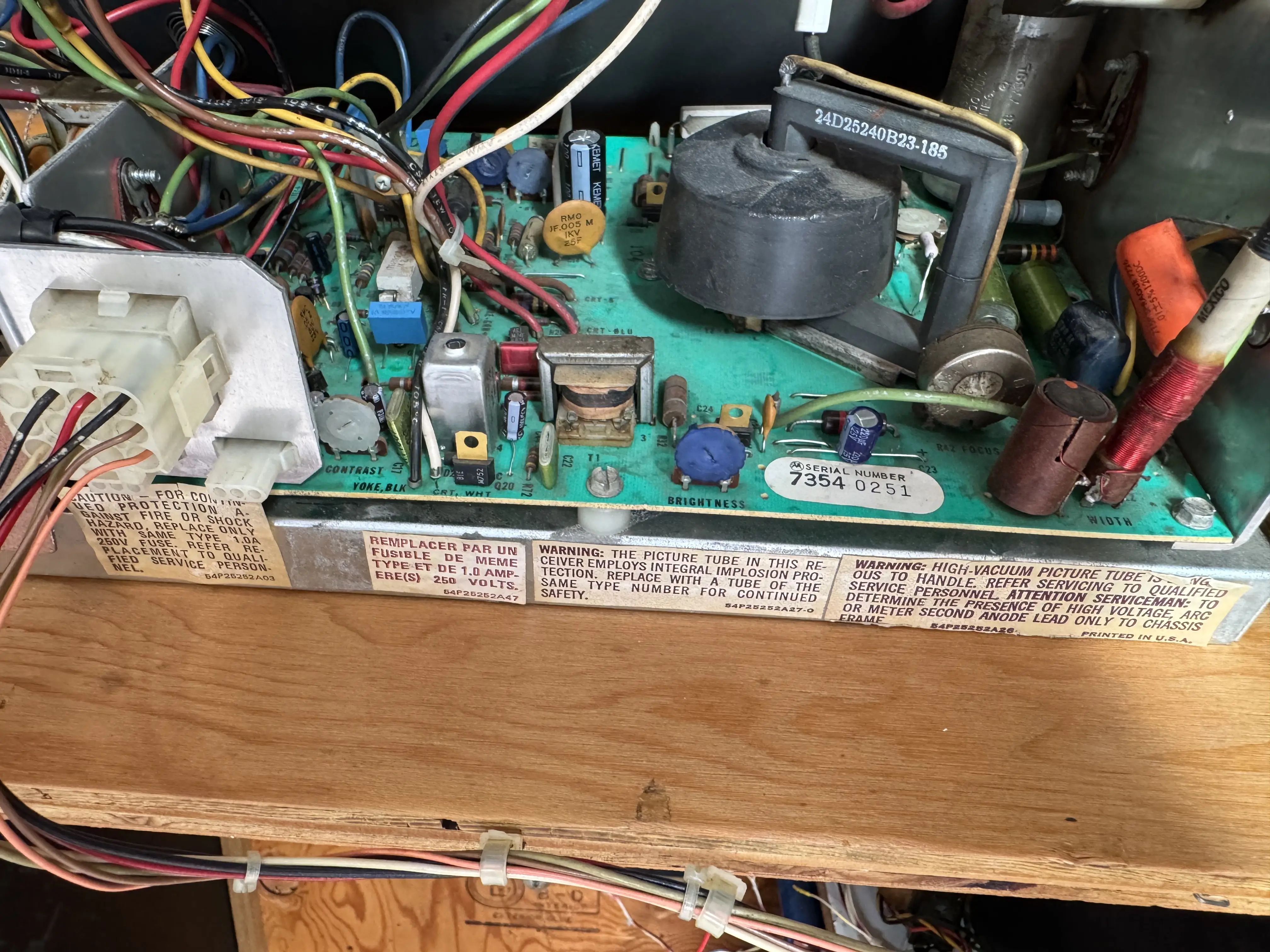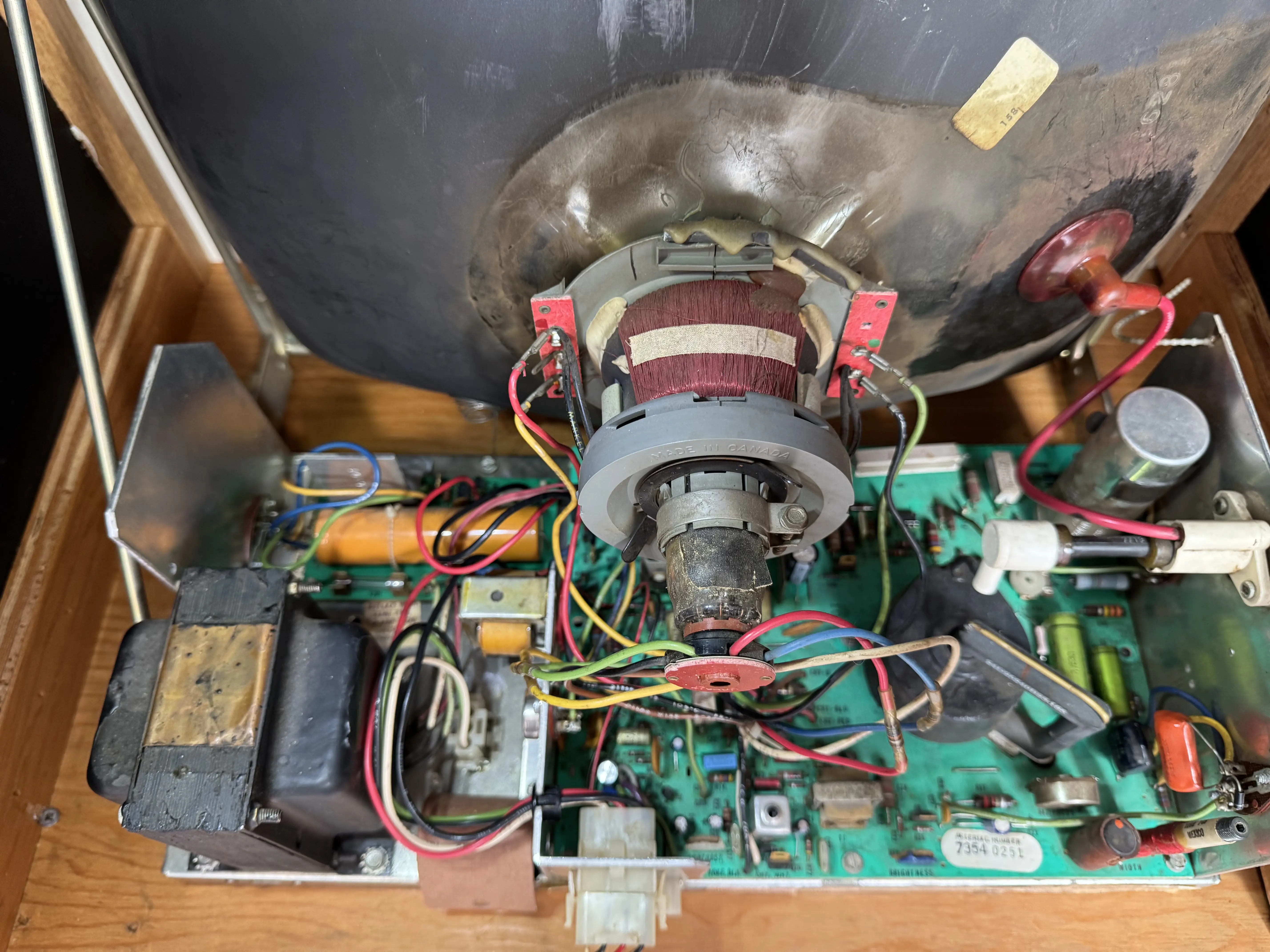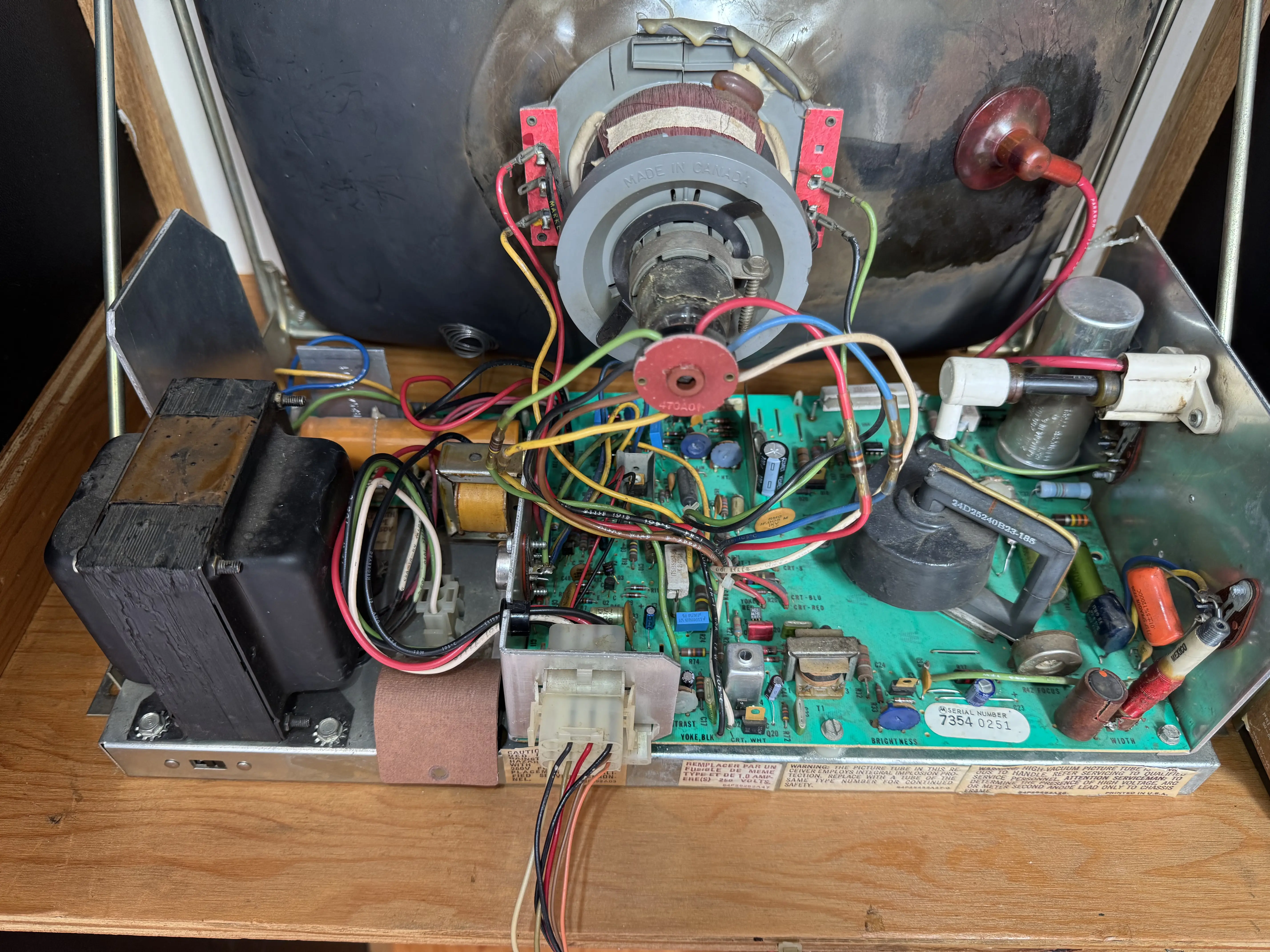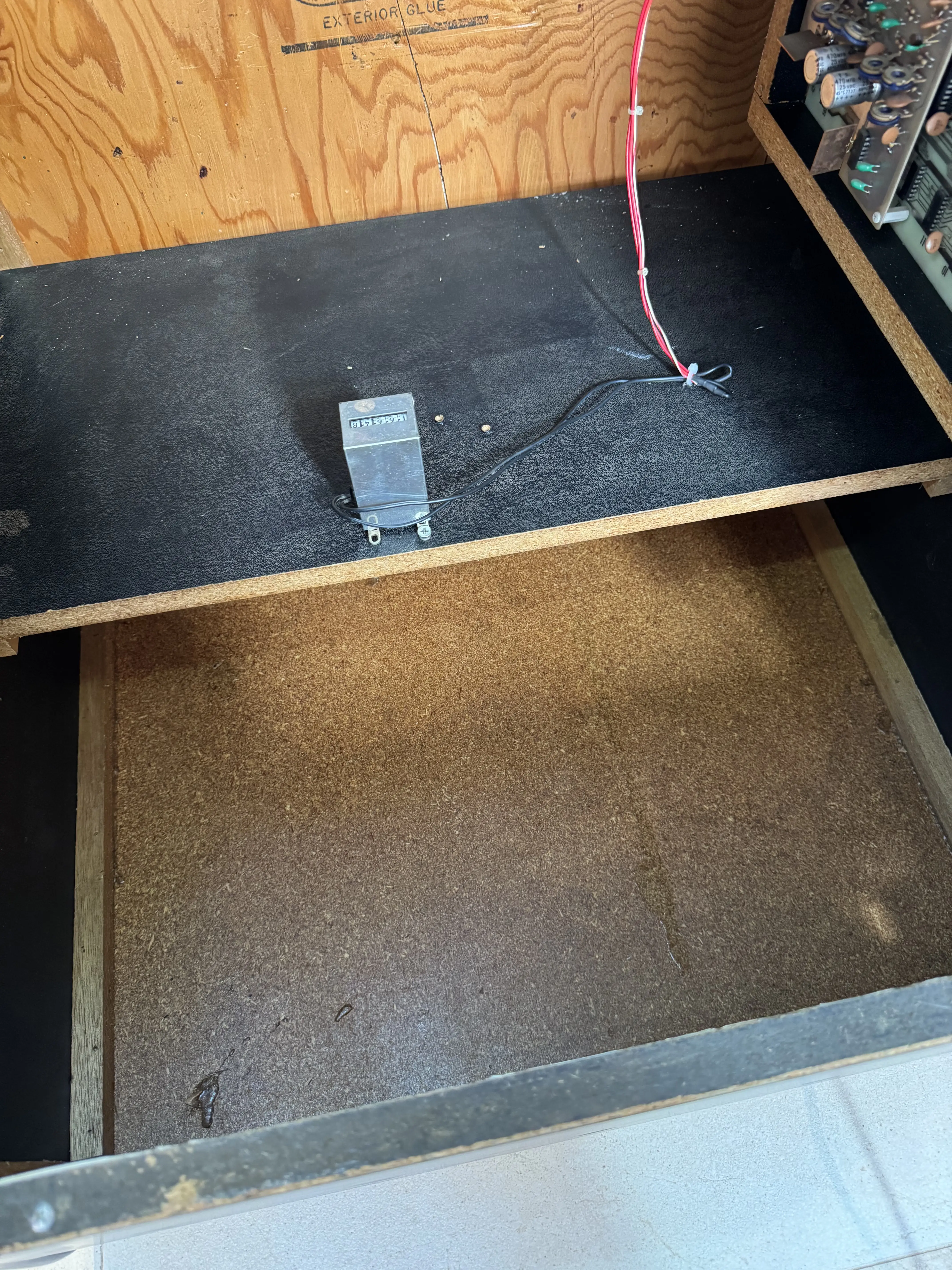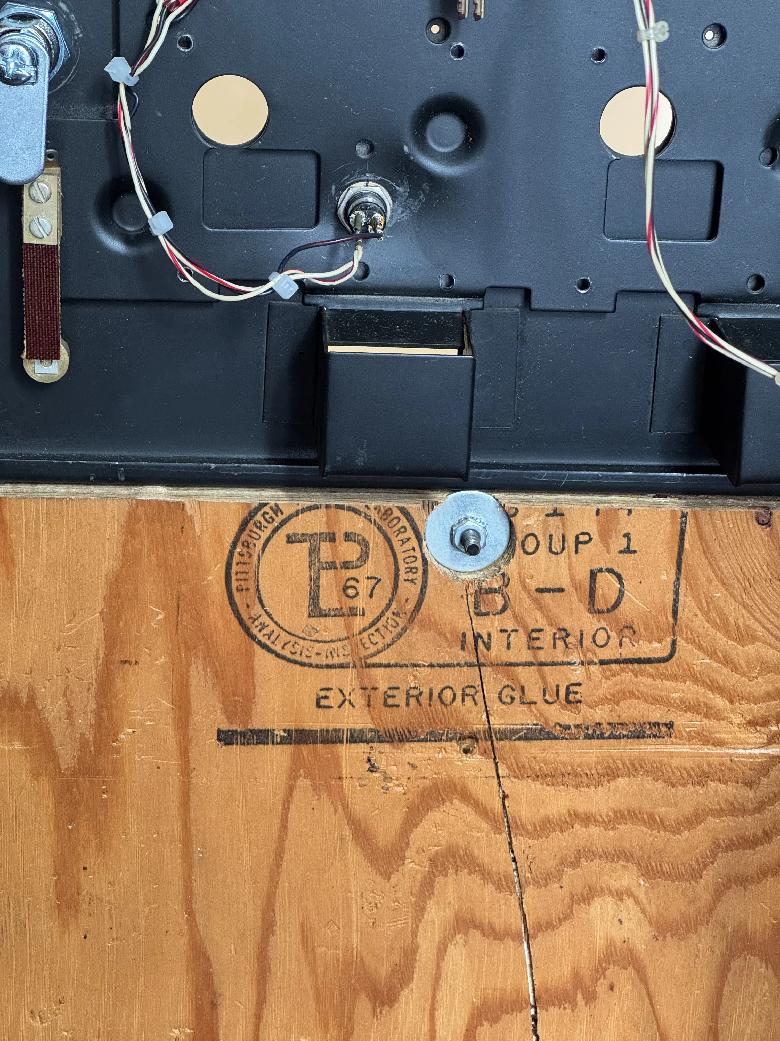 Internamente, a eletrônica está em excelente estado. Todos os transformadores originais foram mantidos, bem como o chicote, os alto-falantes e, principalmente, a PCB e o monitor. Nas fotos a seguir, é possível perceber o tom ligeiramente mais escuro das chapas de aglomerado tratadas com selante para evitar o esfarelamento.