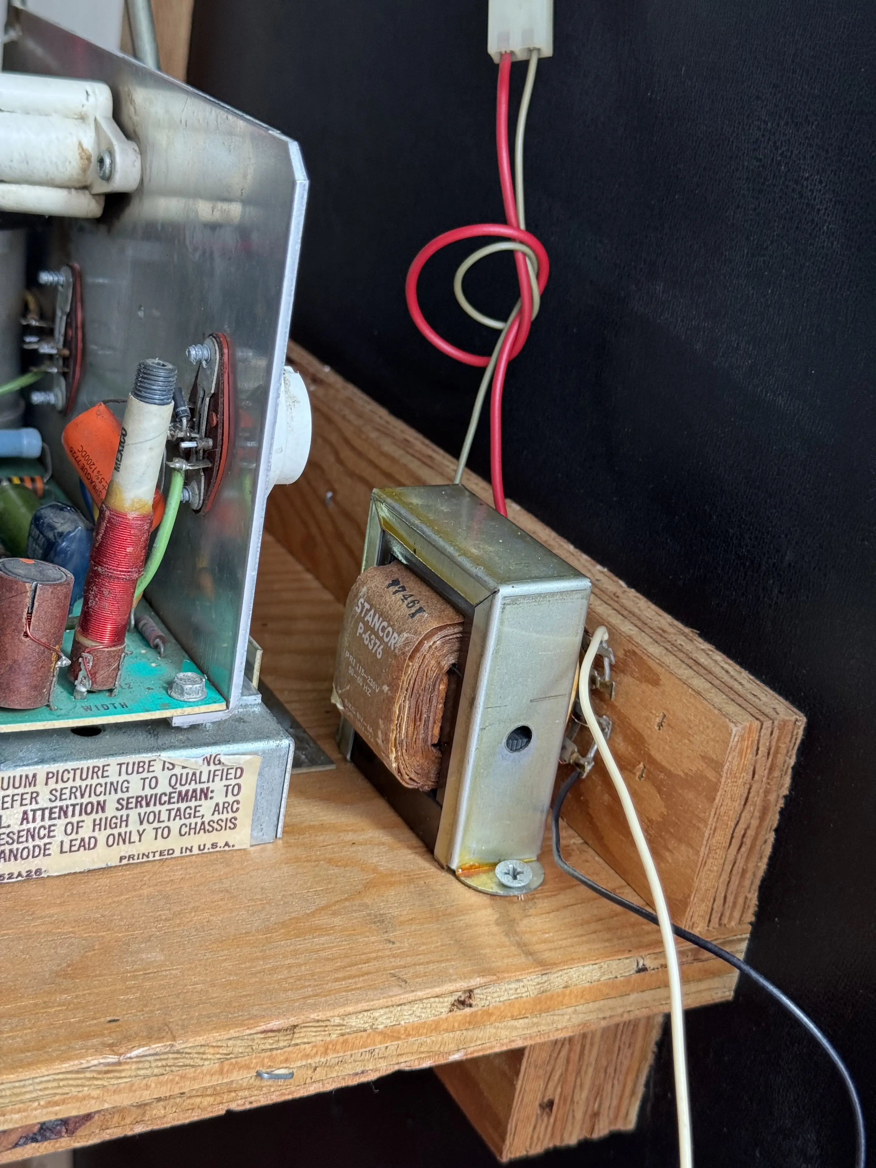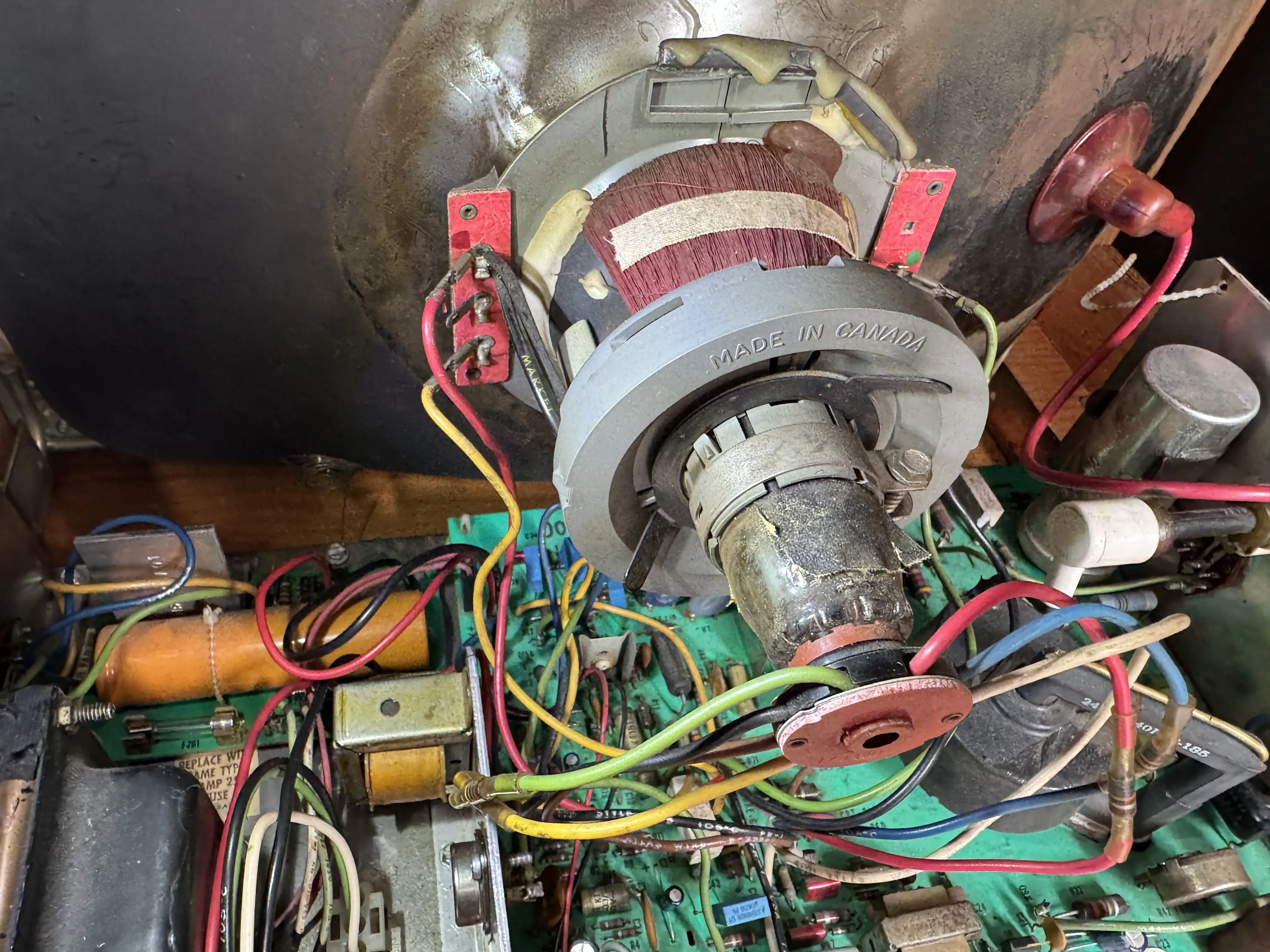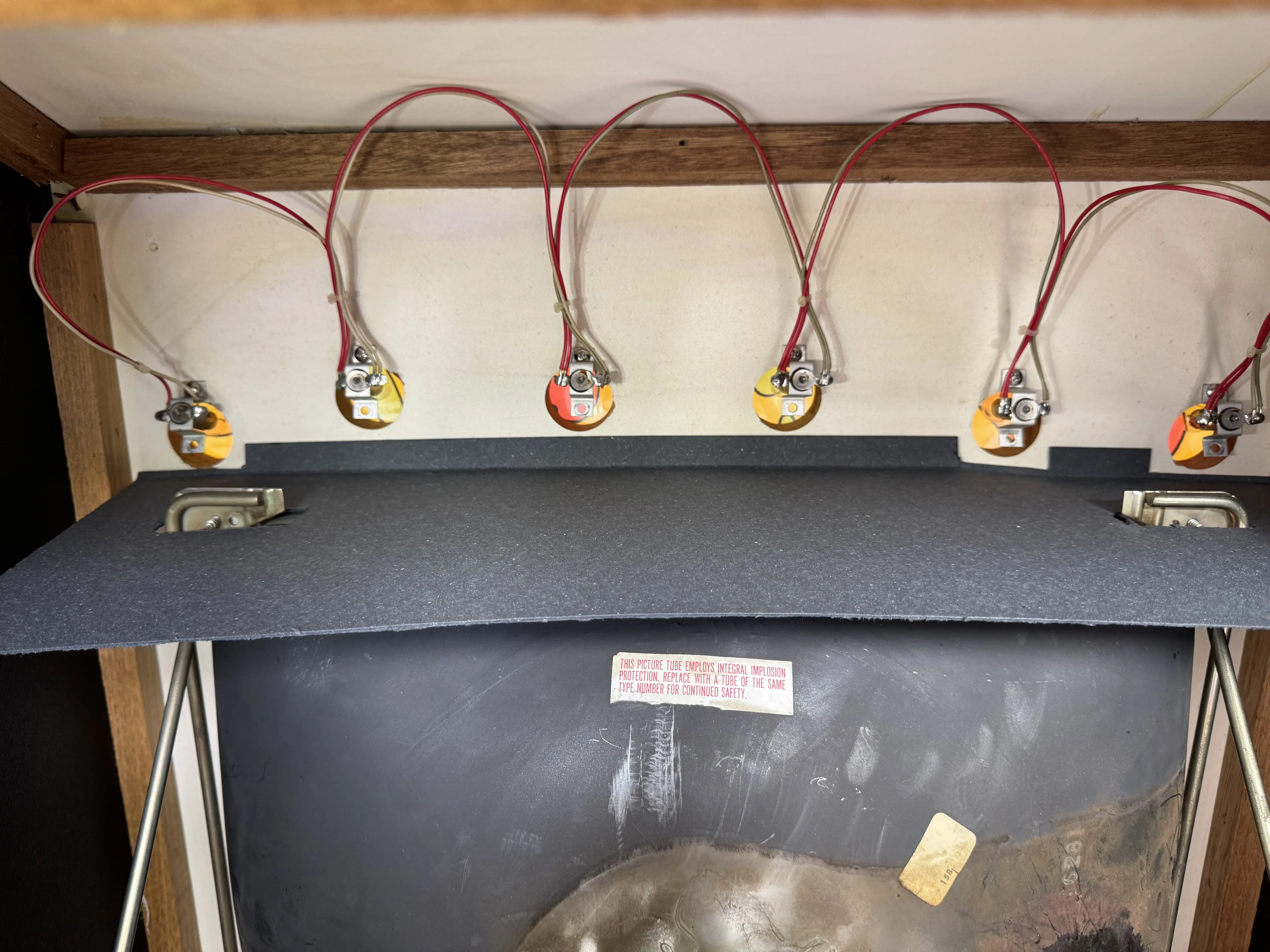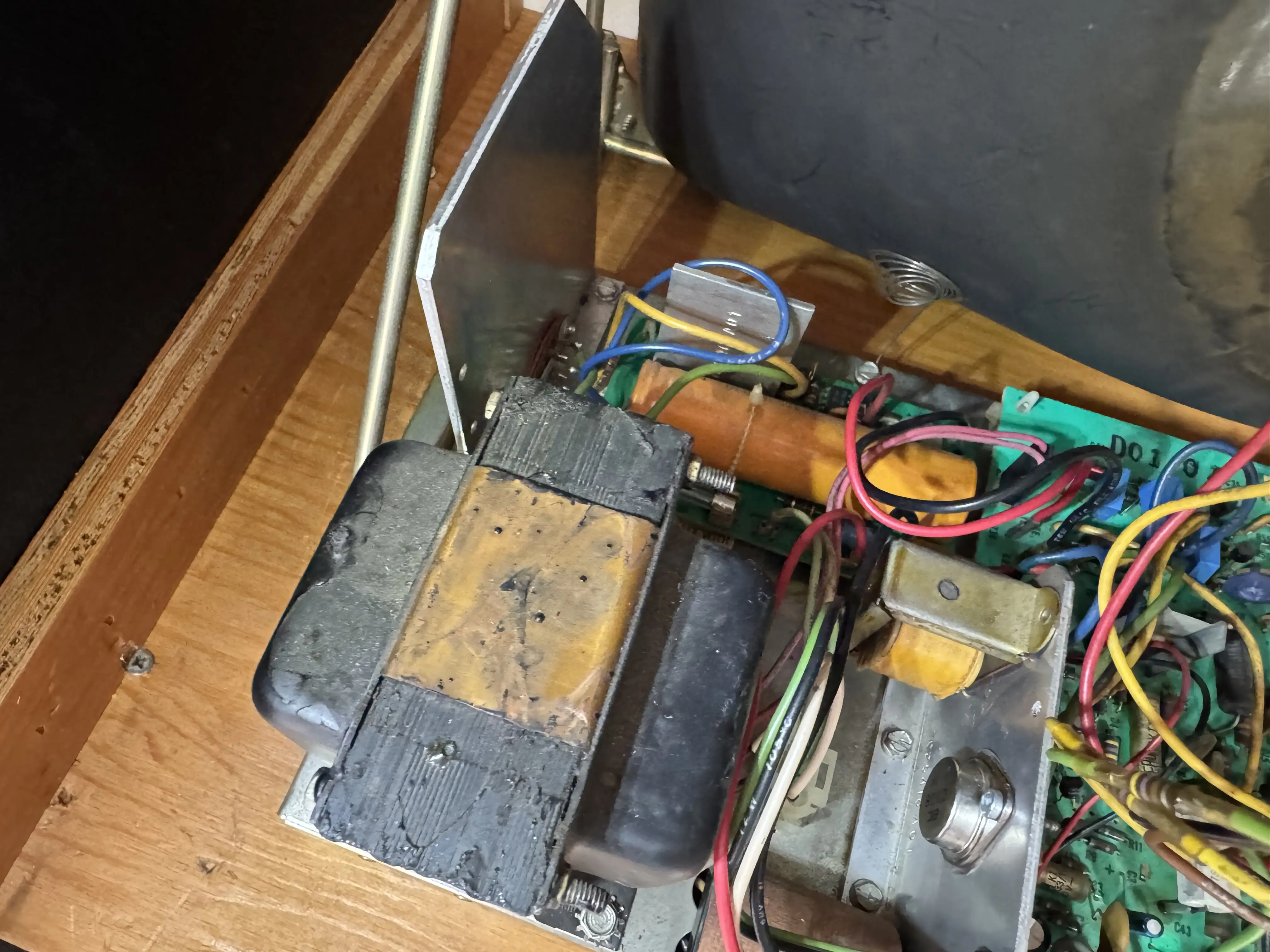 Internamente, a eletrônica está em excelente estado. Todos os transformadores originais foram mantidos, bem como o chicote, os alto-falantes e, principalmente, a PCB e o monitor. Nas fotos a seguir, é possível perceber o tom ligeiramente mais escuro das chapas de aglomerado tratadas com selante para evitar o esfarelamento.