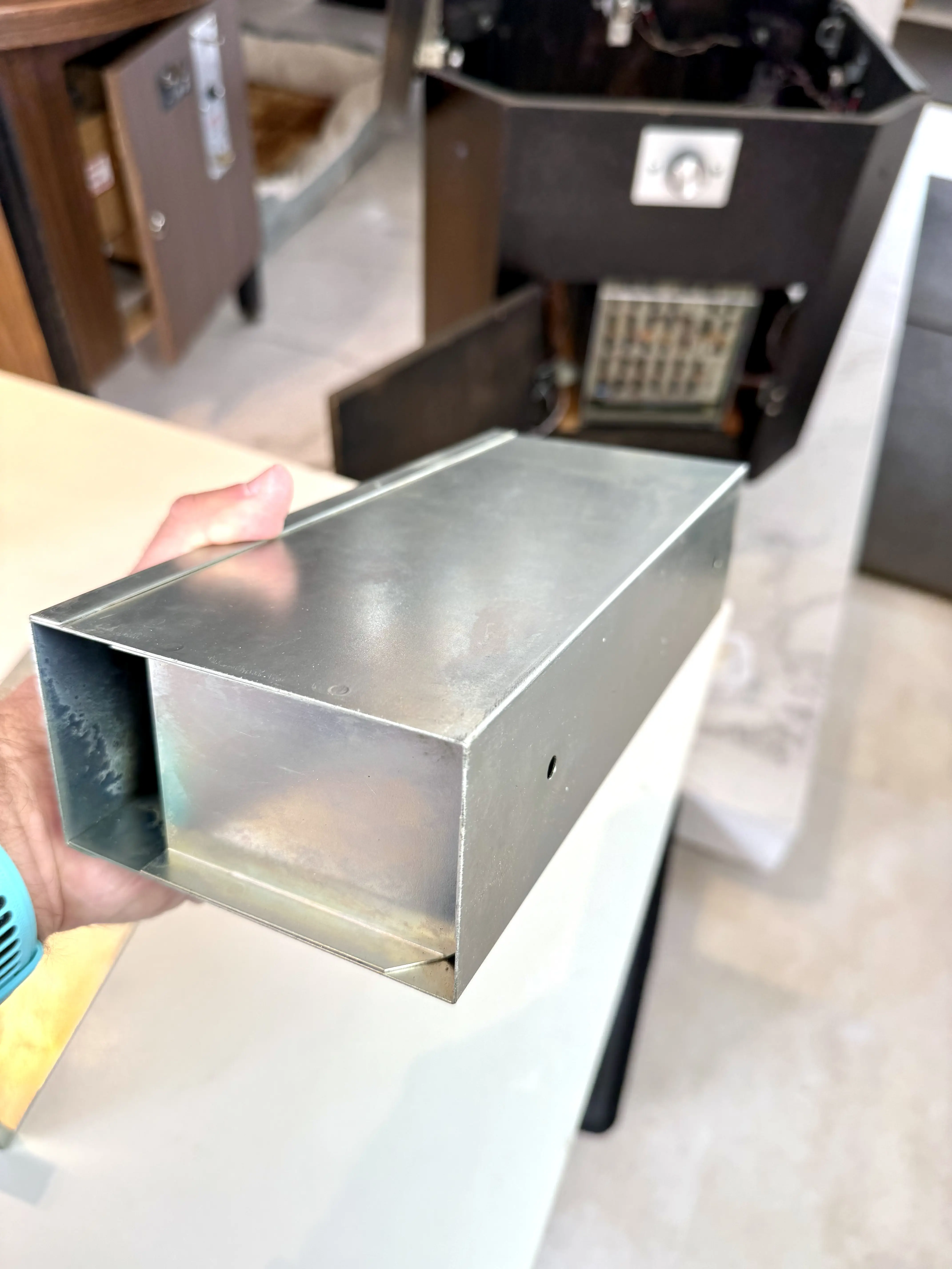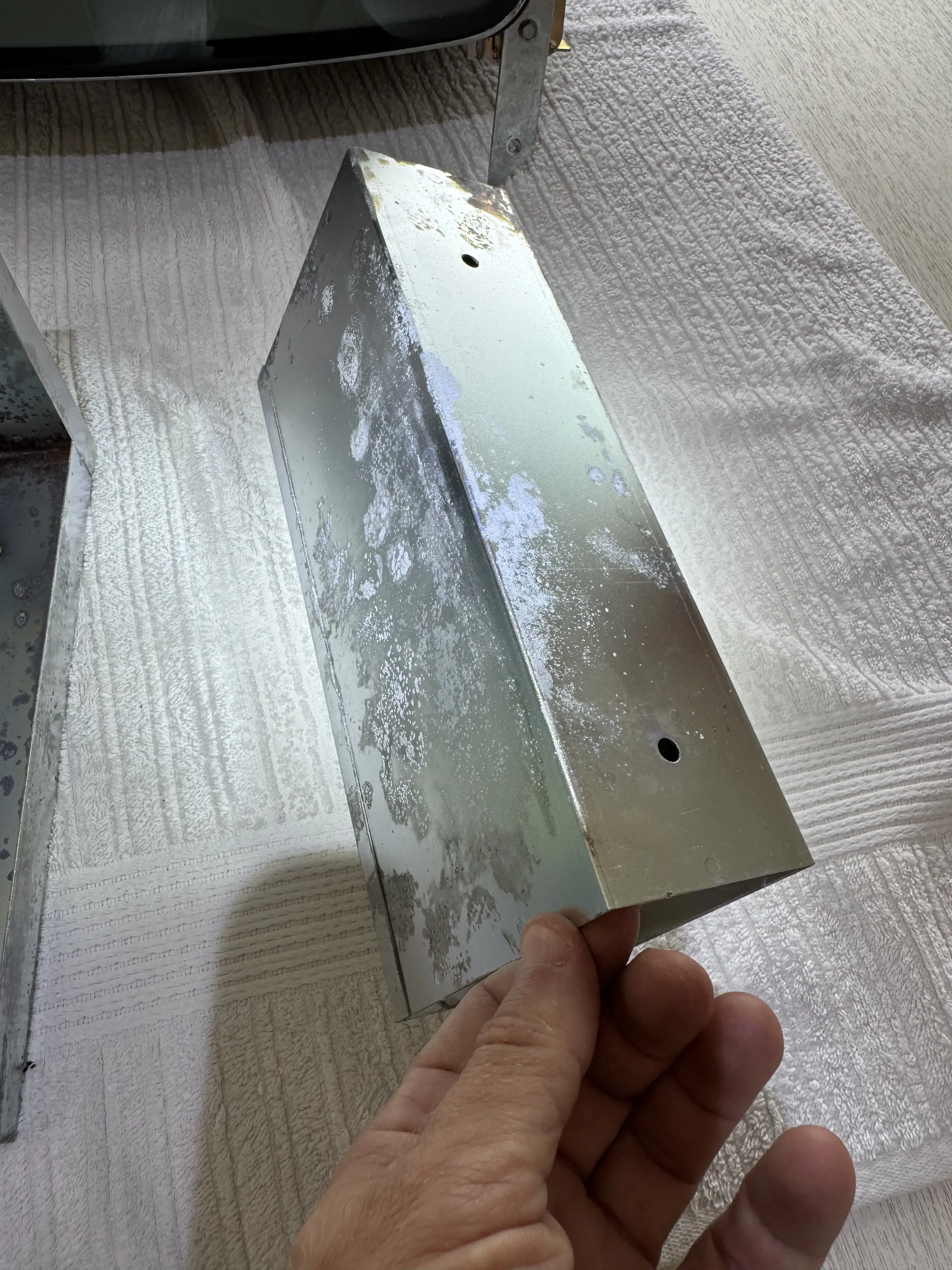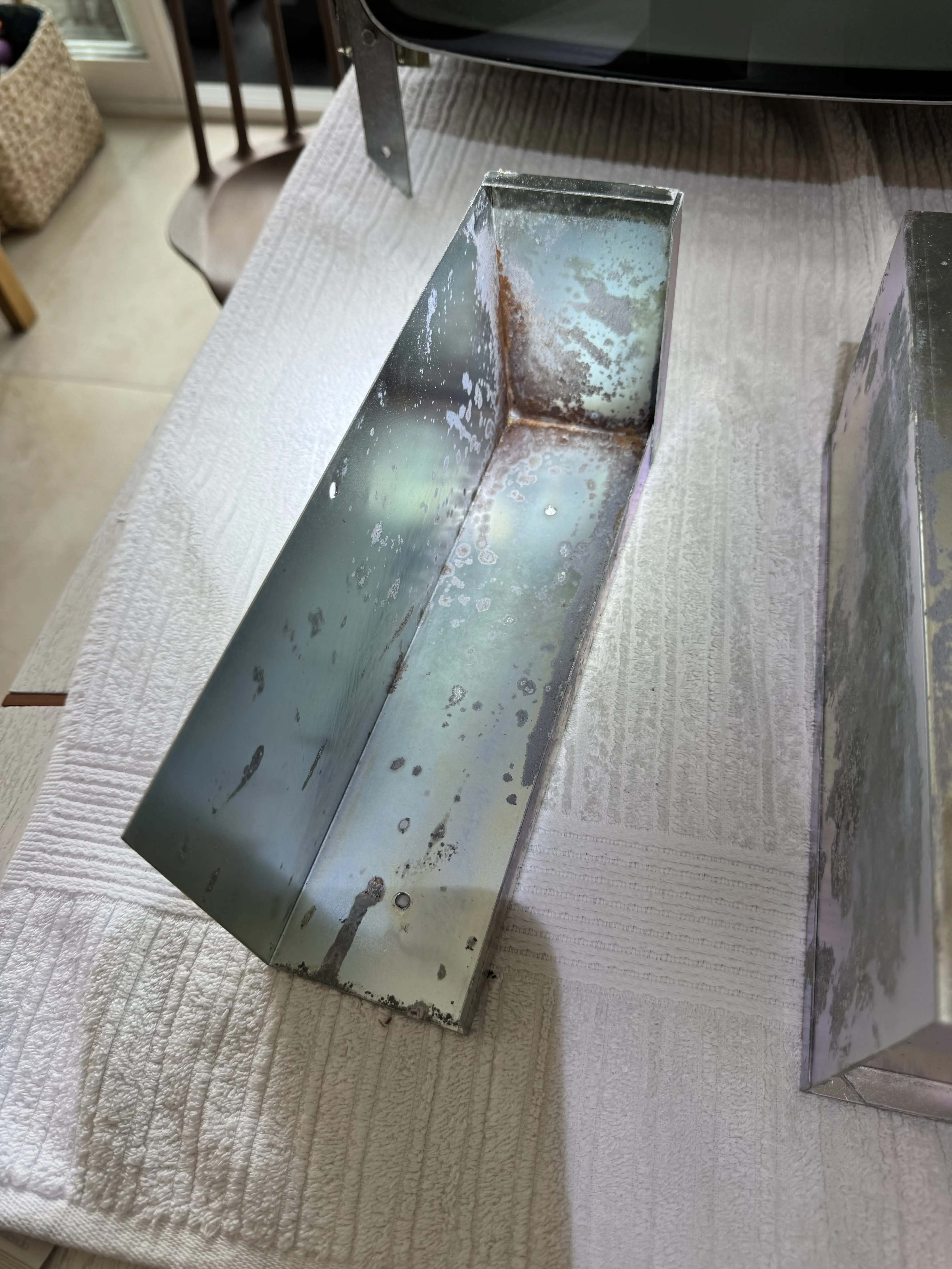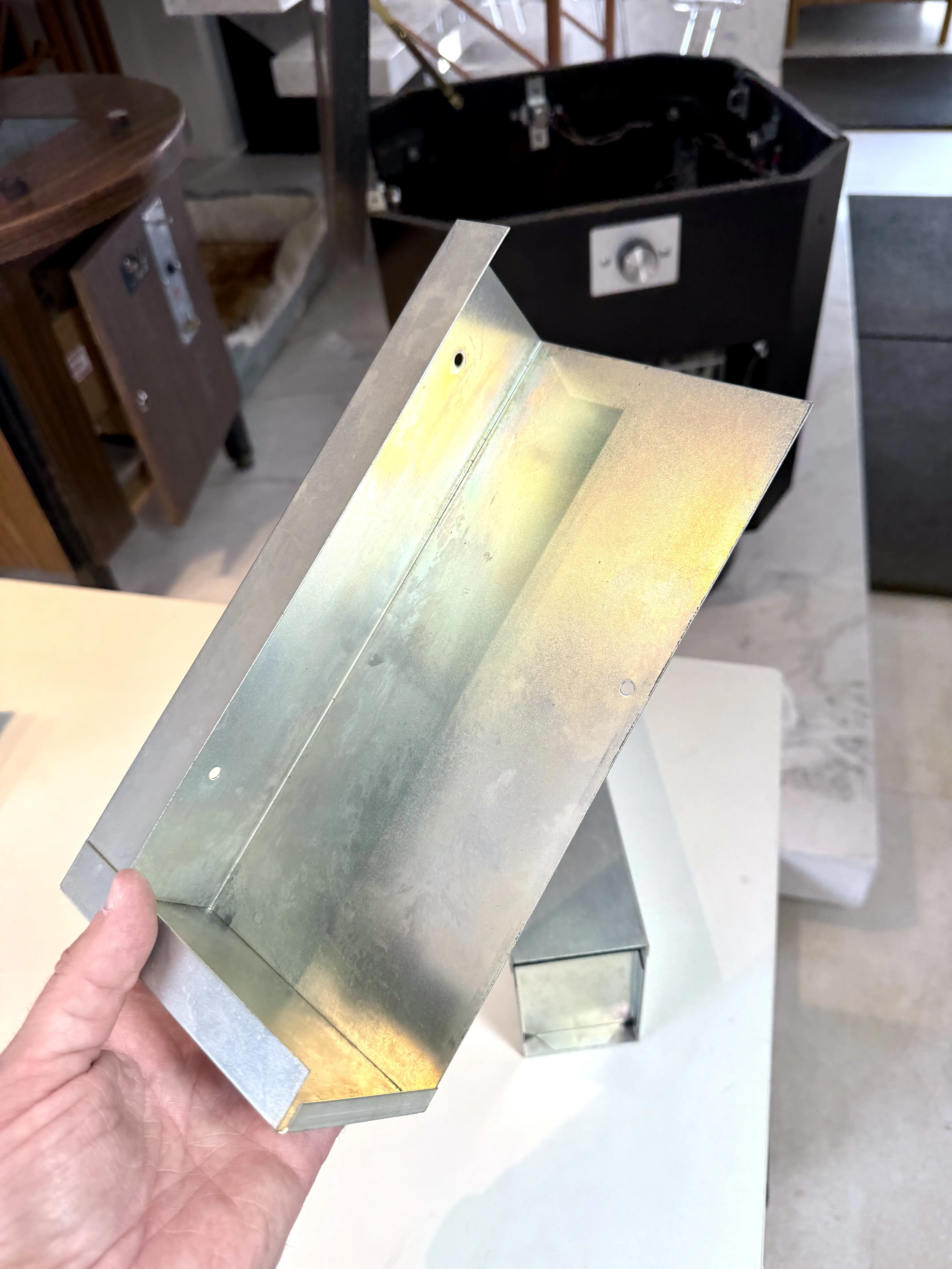 A coin box foi enviada para um banho de zinco, mantendo o tom original, ou seja, zinco branco. A zincagem não elimina algumas manchas, que já estão em camada mais profunda do metal. Mesmo considerando isso, o resultado ficou excelente: