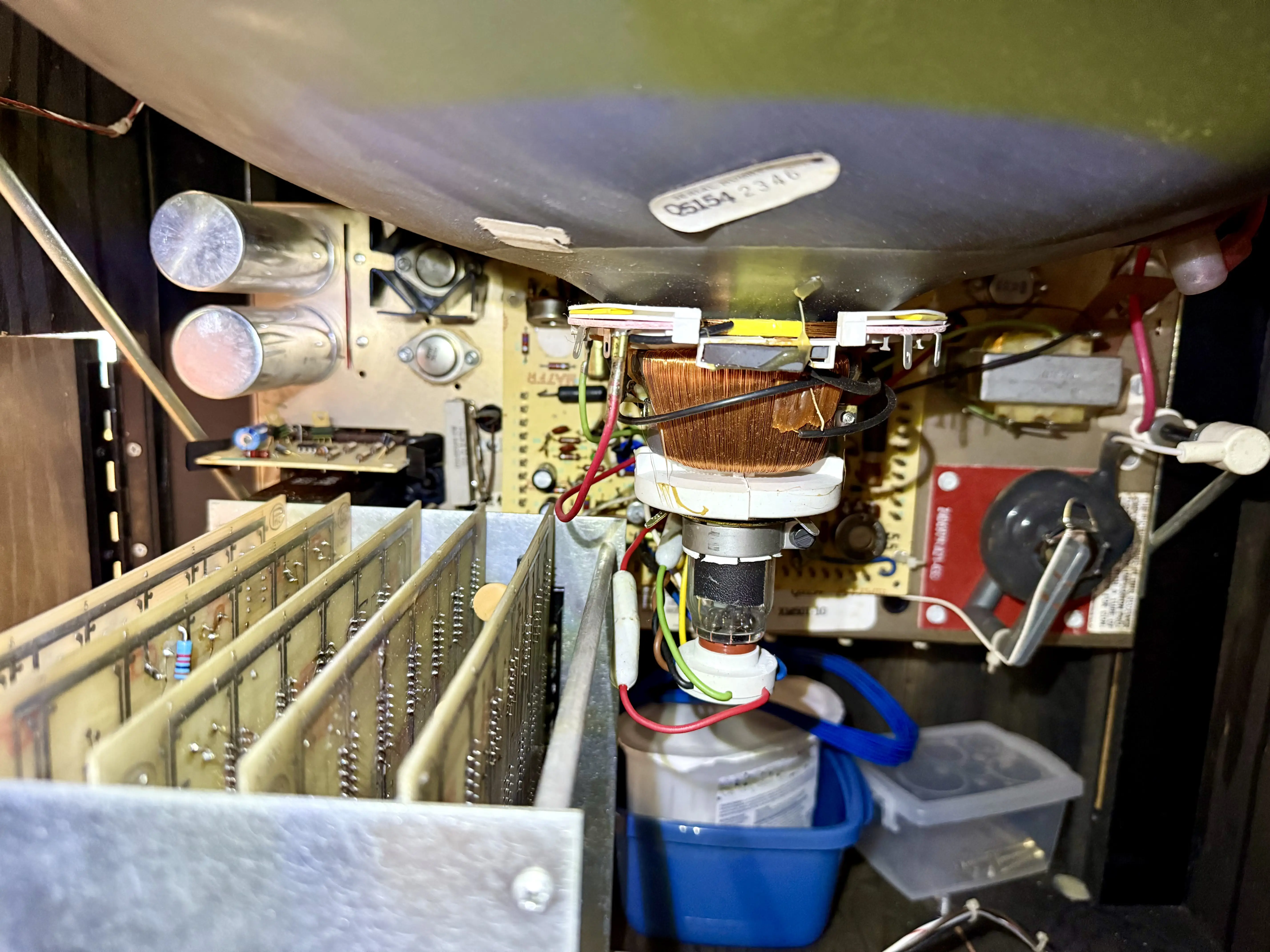 Aliás, como uma importante observação que já mencionei outras vezes, o espaço no interior do gabinete do Inca é extremamente reduzido. Nestas duas fotos, é possível perceber, na vista pela porta de serviço, como a fonte transformadora do monitor quase encosta no boardset, enquanto, na vista da coin door, nota-se a incômoda distância entre o pescoço (parte mais sensível do monitor) e o conjunto de placas.