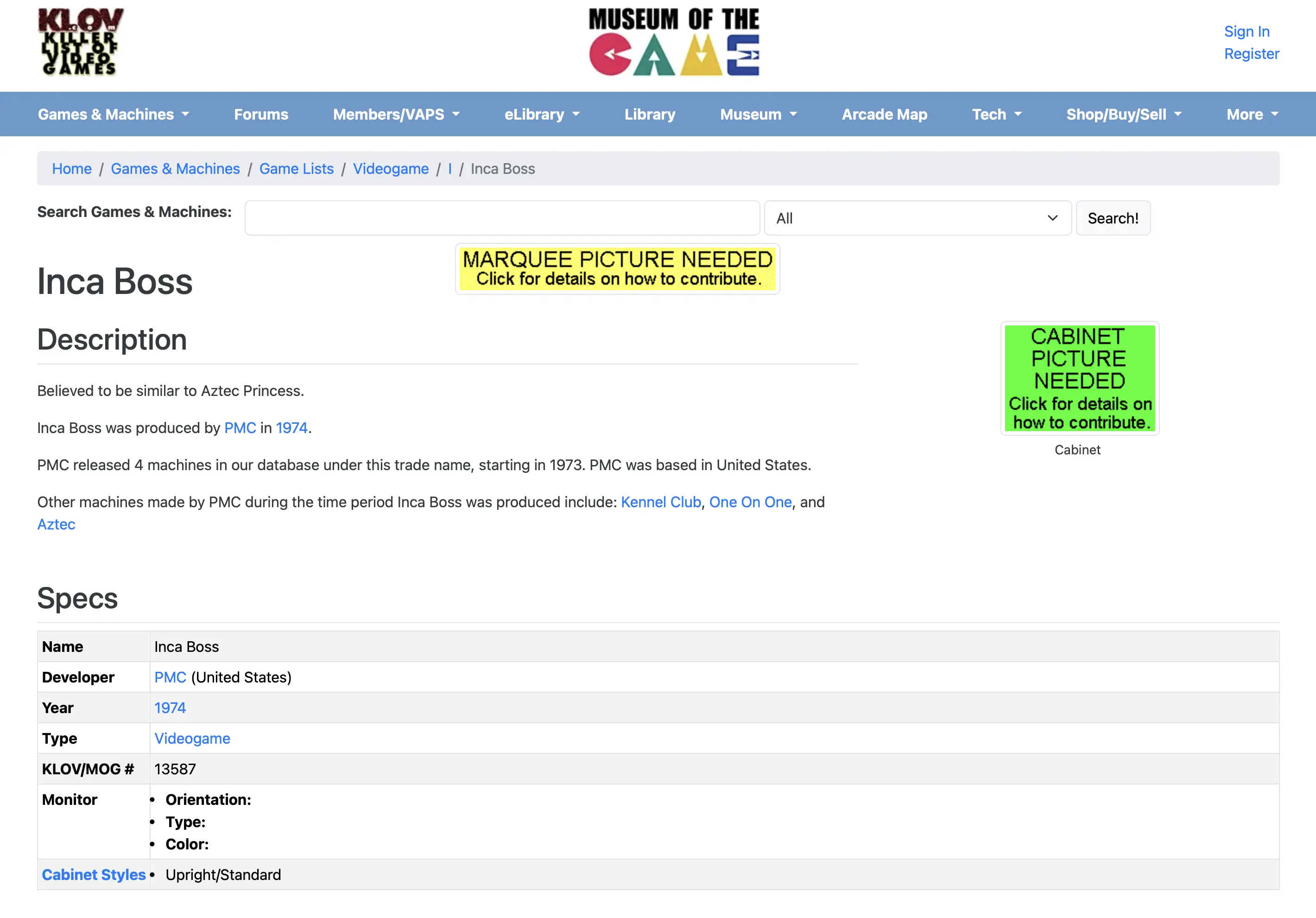 O principal banco de dados mundial de arcade games é o Arcade Museum, antigamente conhecido como “Killer List of Videogames”, ou KLOV. Mas, na página deles sobre o Inca, não era possível encontrar, até então, nenhuma informação a respeito: