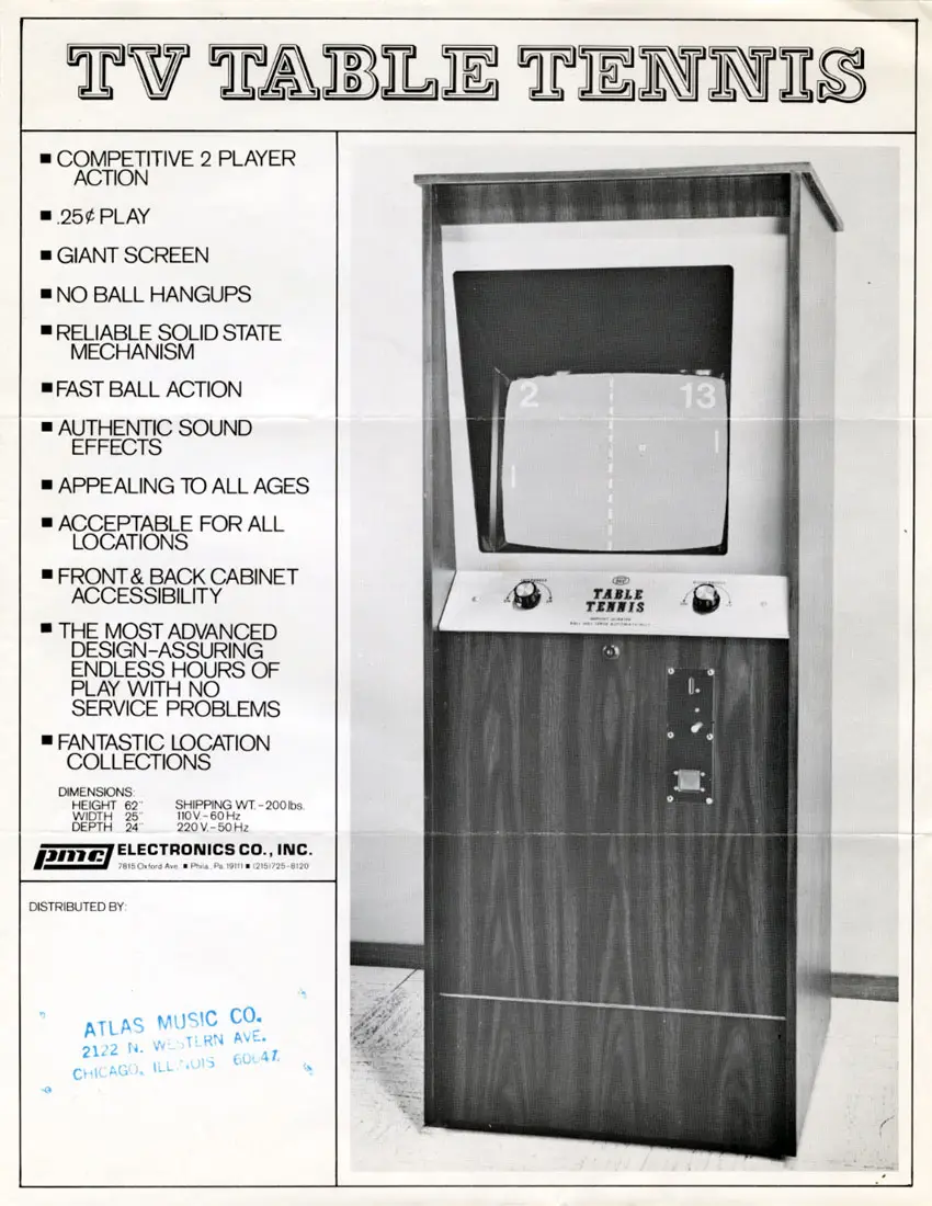 - TV Table Tennis, de 1973: aparenta ser seu primeiro video arcade, com um jogo que é um clone direto de Pong.