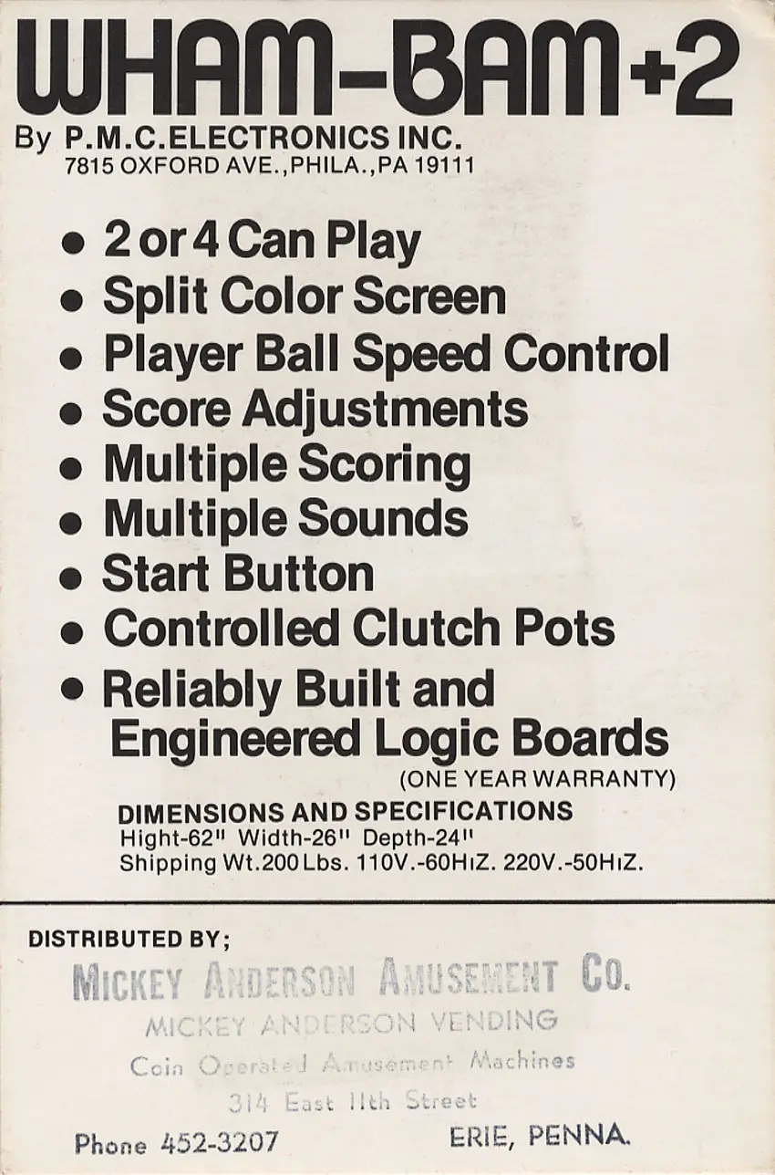 - Wham Bam, de 1974: gabinete estilo Upright com um jogo estilo Ball and Paddle para até 2 jogadores.