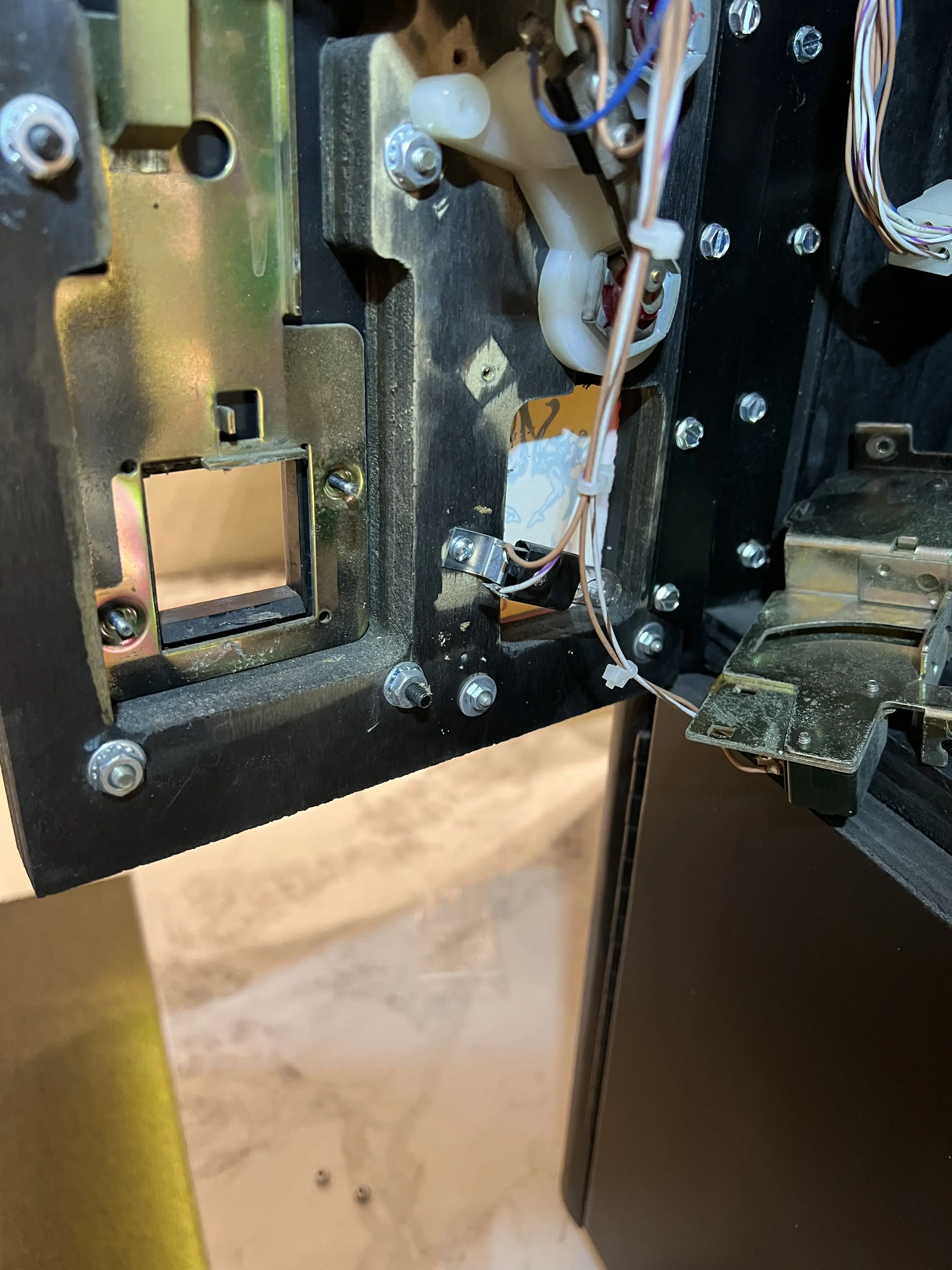 Porém, na prática, a peça travou na caixa metálica de rejeição de moedas, que fica atrás da porta. Isso pode indicar que este flap talvez seja de um modelo Upright. Para não estragar a peça original, resolvi deixar desta forma no momento, sem a instalação.