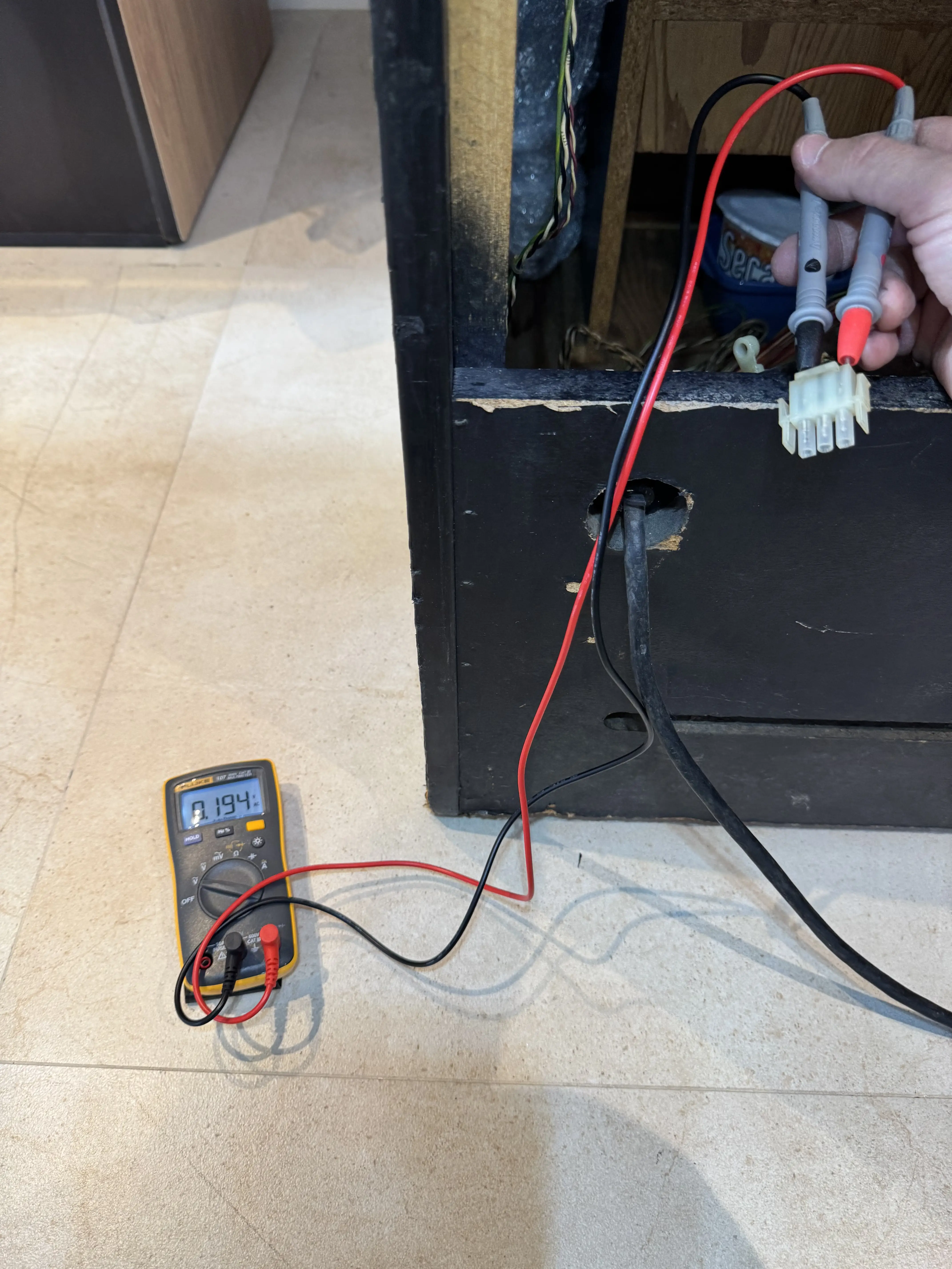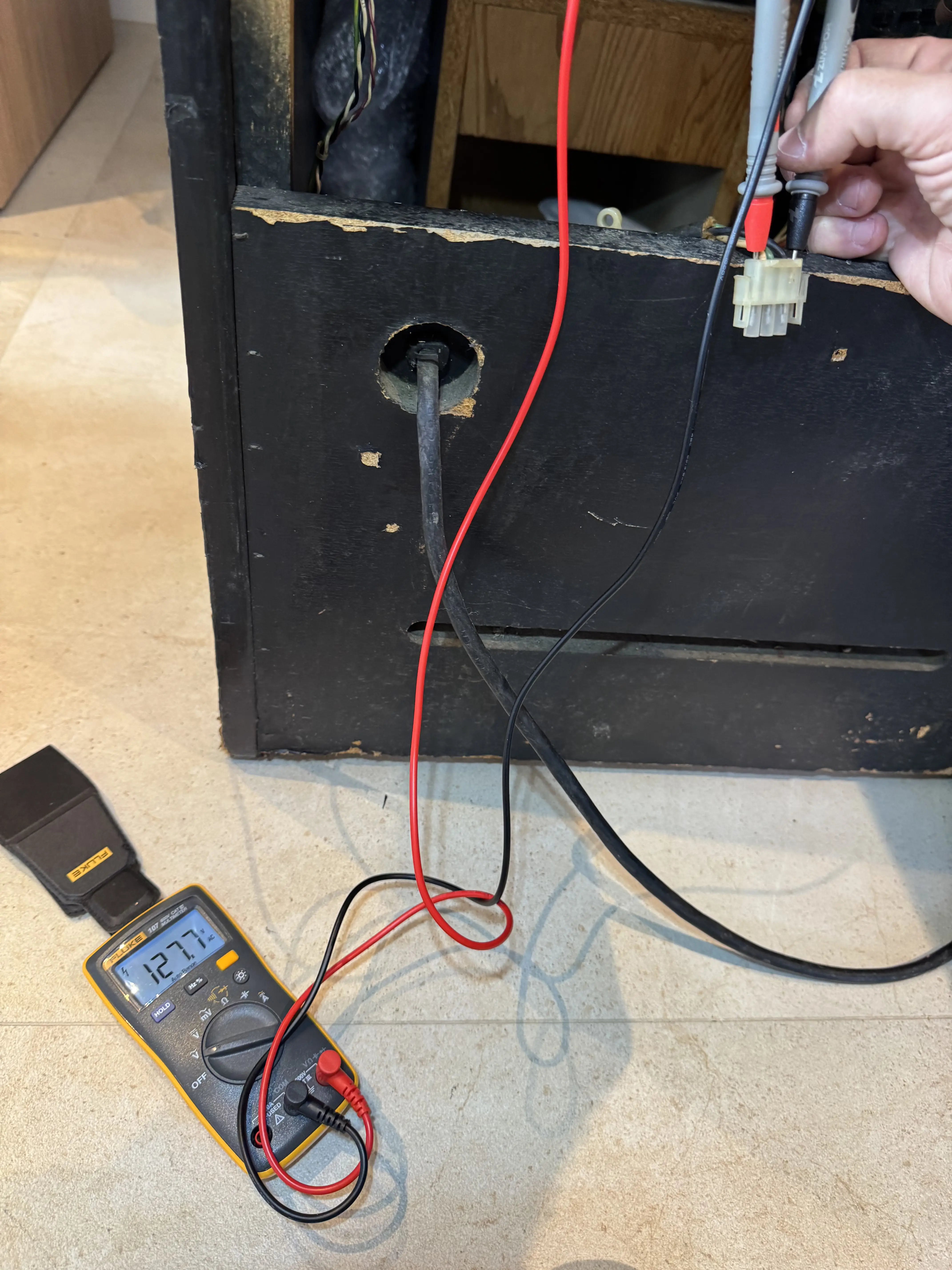 Passei para a realização de testes de saída de voltagem nos pinos de saída do power brick. Achei o diagrama técnico um pouco confuso, e as voltagens, difíceis de corresponderem exatamente. Mas eu já vi isso acontecer outras vezes em circuitos não regulados e também quando, ao conectar componentes antigos, a corrente cai ligeiramente.