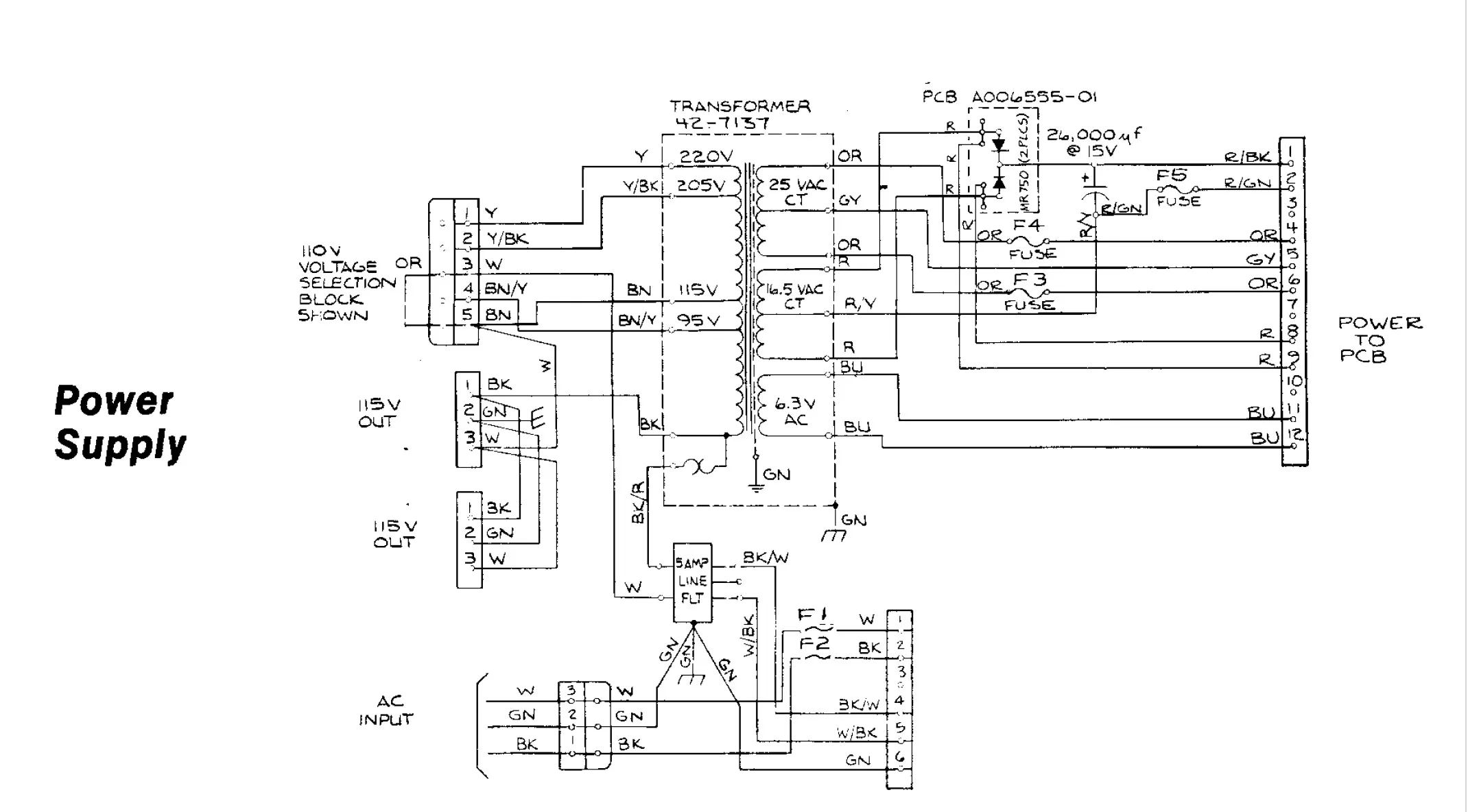Lembrando que este conjunto de força não gera 5VDC para alimentar a PCB, pois ela recebe corrente AC e realiza a conversão na própria placa, um modelo defasado e problemático que incrivelmente a Atari ainda utilizou neste gabinete de 1979, quando já havia muitas outras tecnologias disponíveis, incluindo a geração de corrente contínua pelo monitor, que o modelo do Video Pinball, inclusive, suportava.