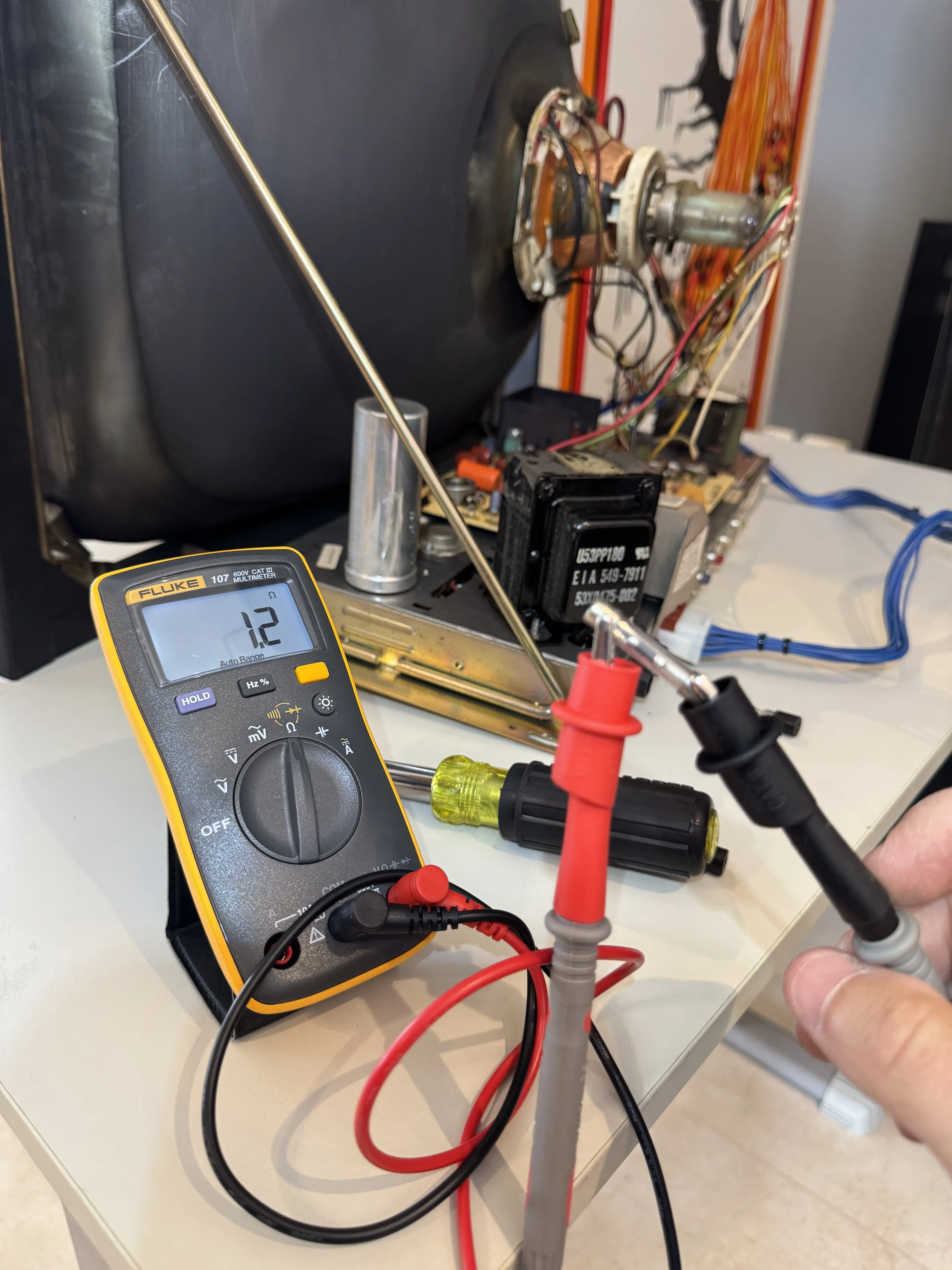 E, por fim, testei o circuito de alta tensão do monitor, cujo resultado foi positivo, medindo em torno de 14.000V, o que é esperado para estes monitores em preto e branco. É interessante observar também a rápida queda de voltagem ao desligar a máquina, indicando que o circuito de autodescarregamento do monitor está funcionando perfeitamente. A sonda de alta tensão não possui essa velocidade, descarregando os tubos de forma mais lenta, o que pode ser observado naqueles monitores que não possuem este circuito, como o Electrohome G08 do arcade vetorial Star Trek, da Sega.