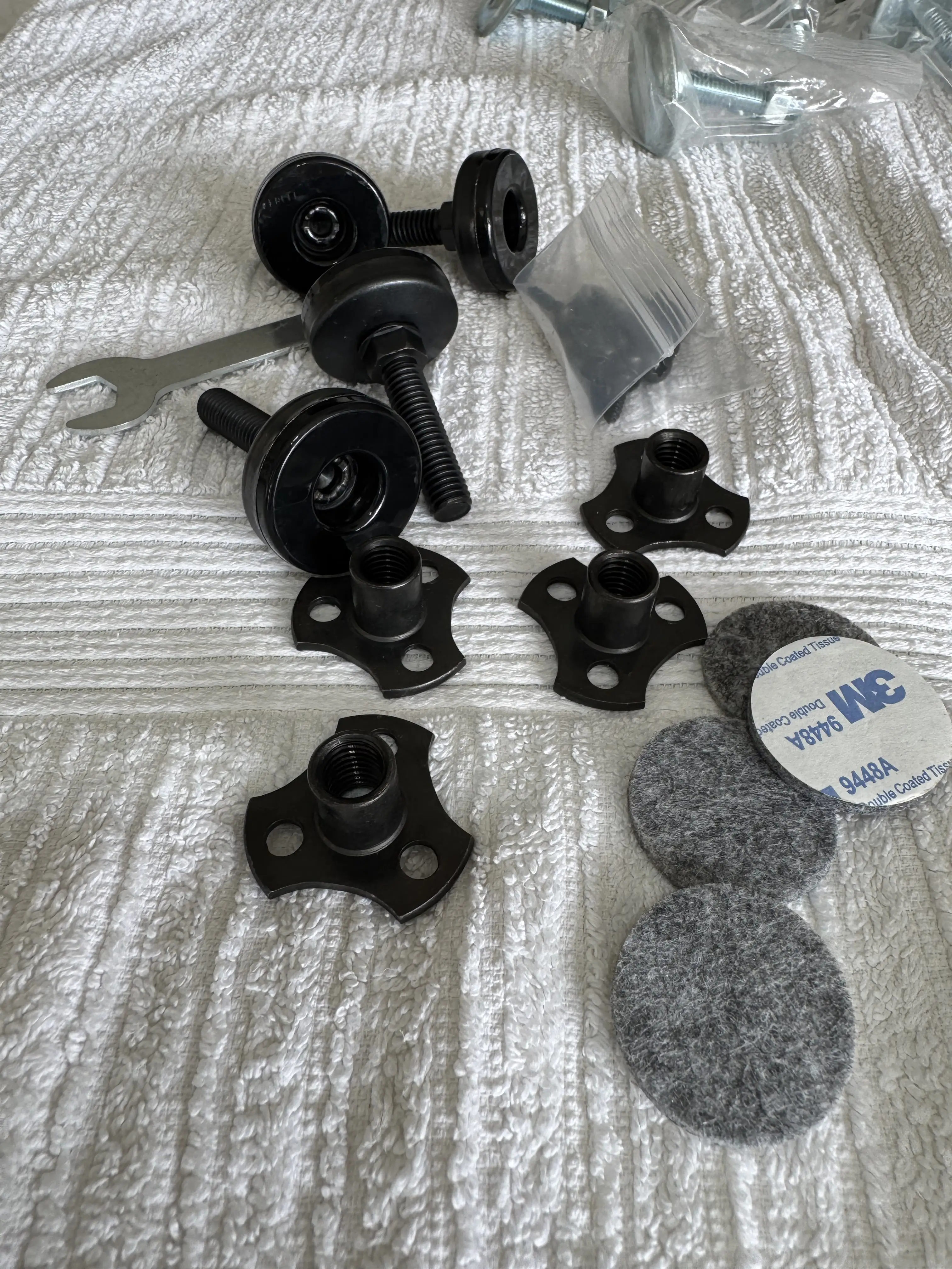 Minha experiência com pés de móveis comprados no Brasil indica que eles não aguentam o peso e o arrasto de gabinete de arcade, quebrando com certa frequência. Por esse motivo, importei um lote dos Estados Unidos, com basicamente 2 tipos de ferragem: