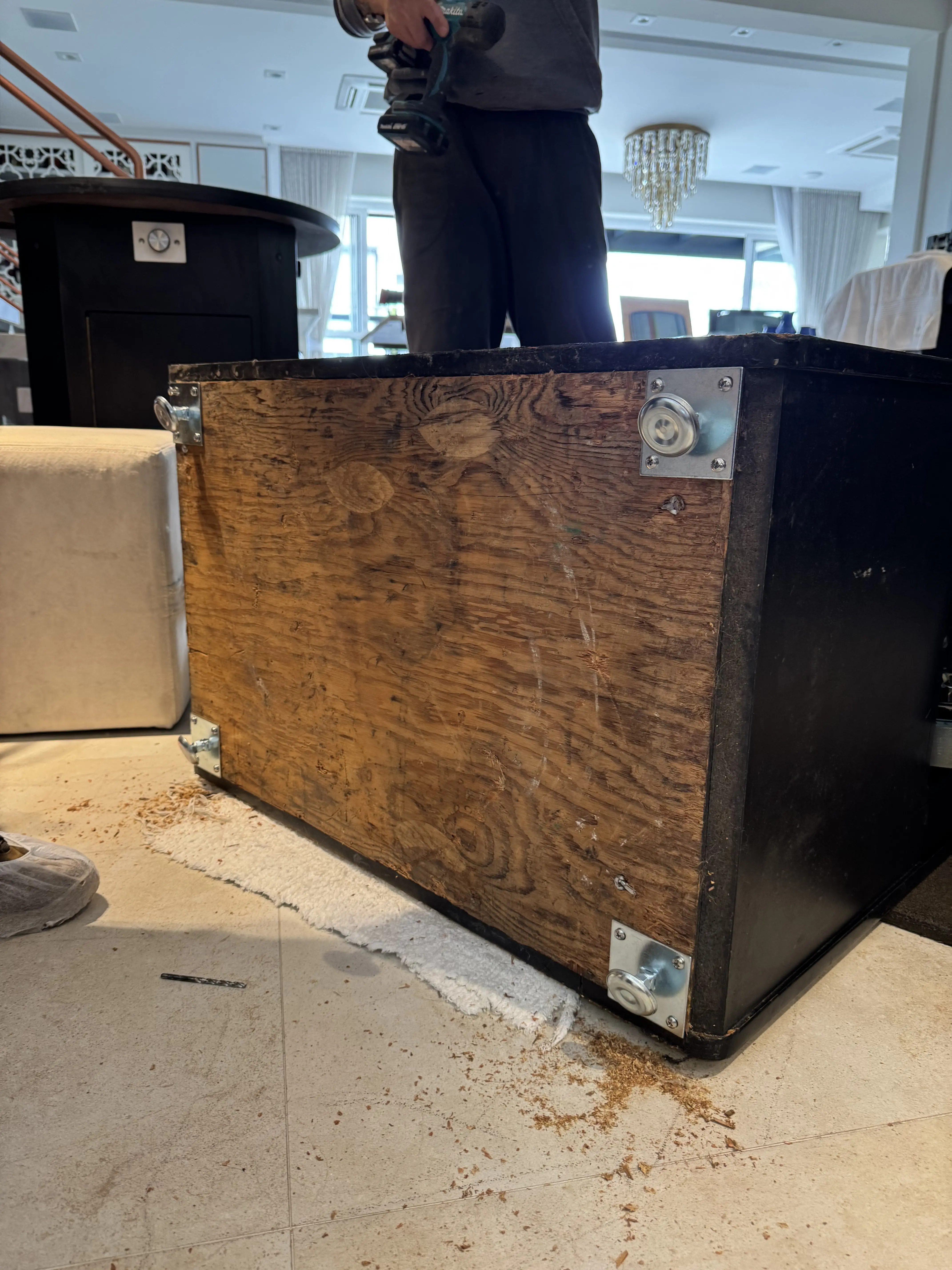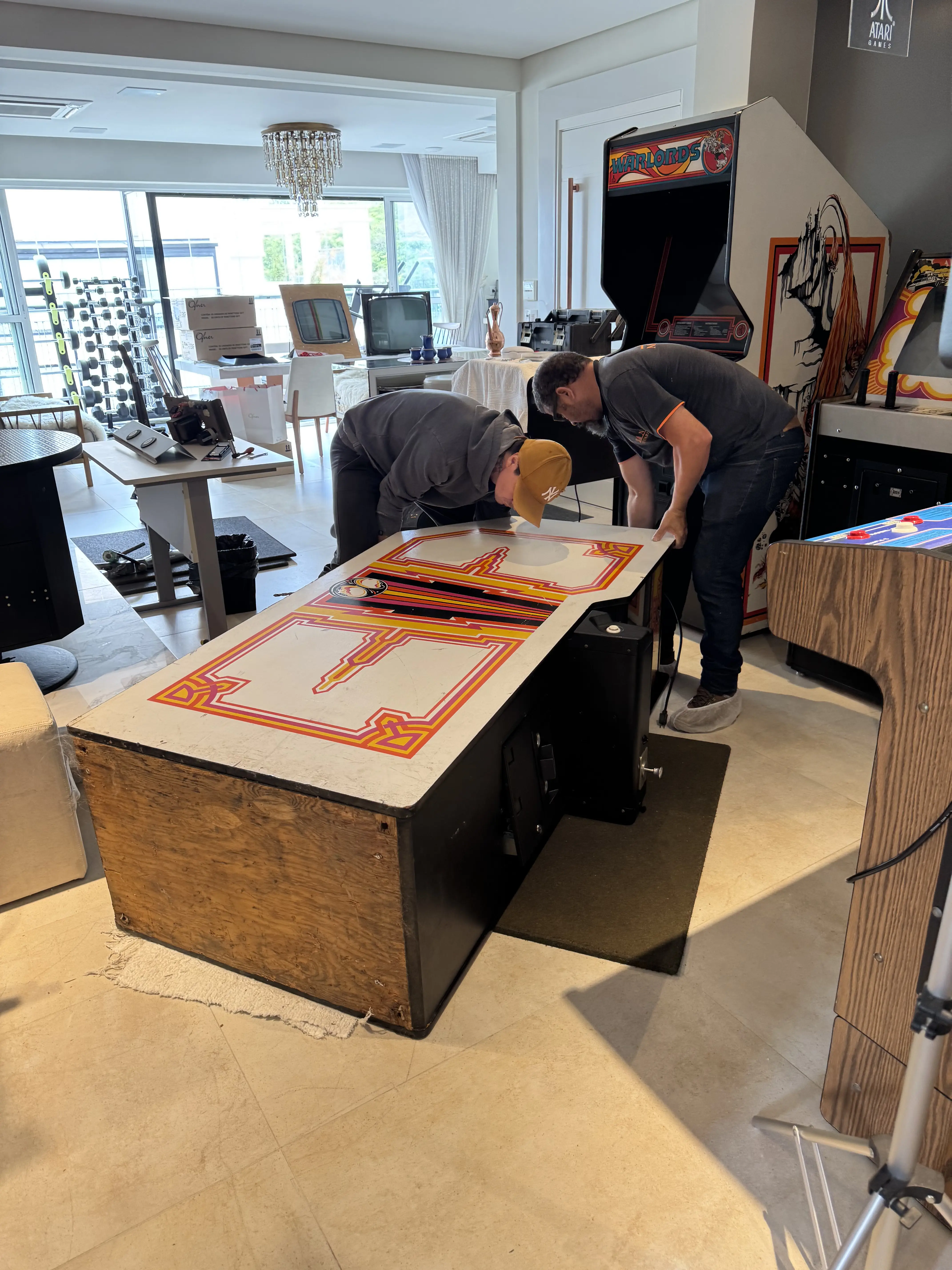 Antes de decidir o nível de restauração do gabinete de arcade Video Pinball, da Atari, eu aproveitei a visita do time de marcenaria da JR&N, que me auxiliou na restauração de diversos gabinetes, como Asteroids Deluxe, Star Trek da Sega, Track & Field, Tank II e Super Breakout, entre outros, para colocar os pezinhos que faltavam.