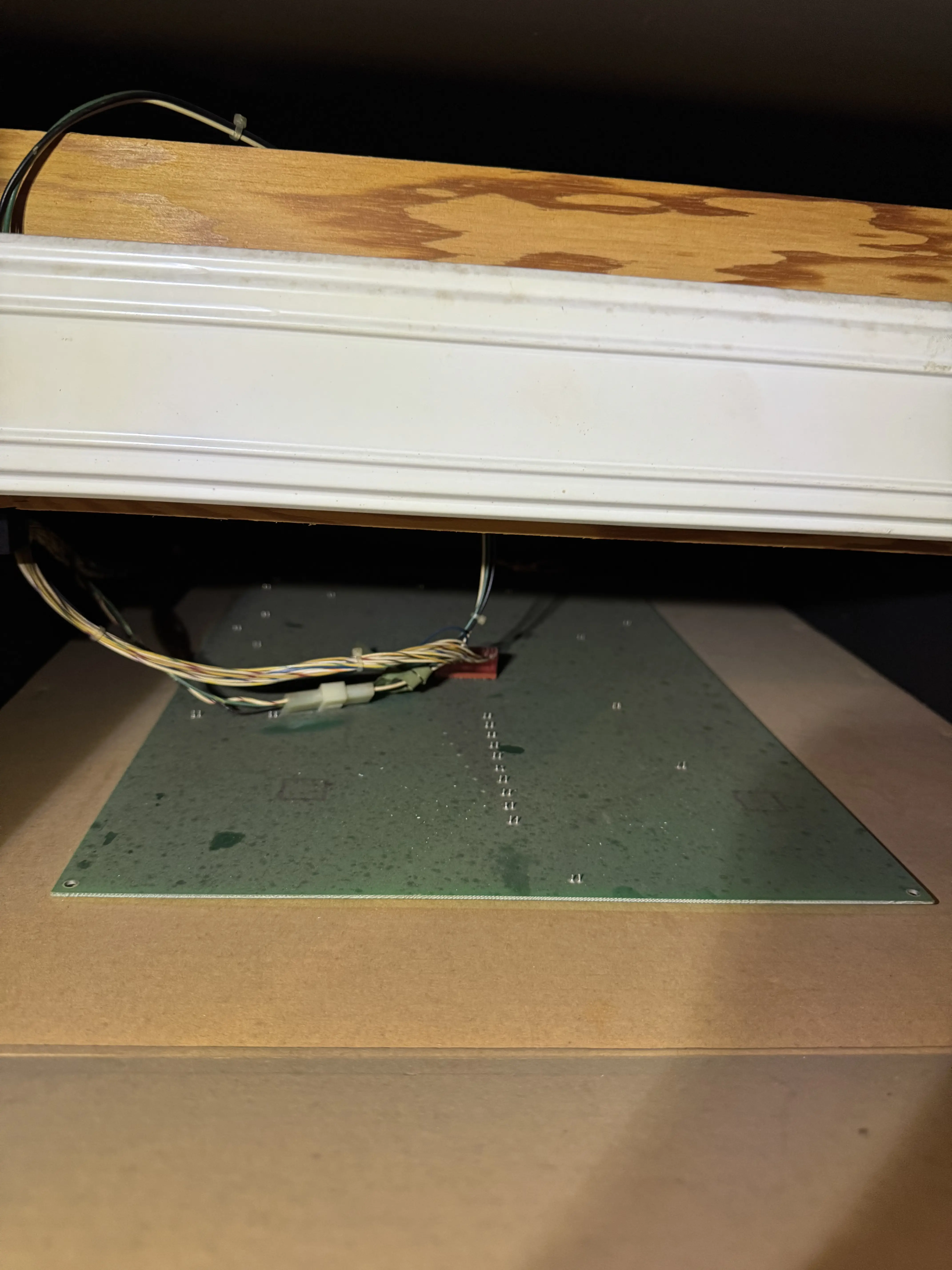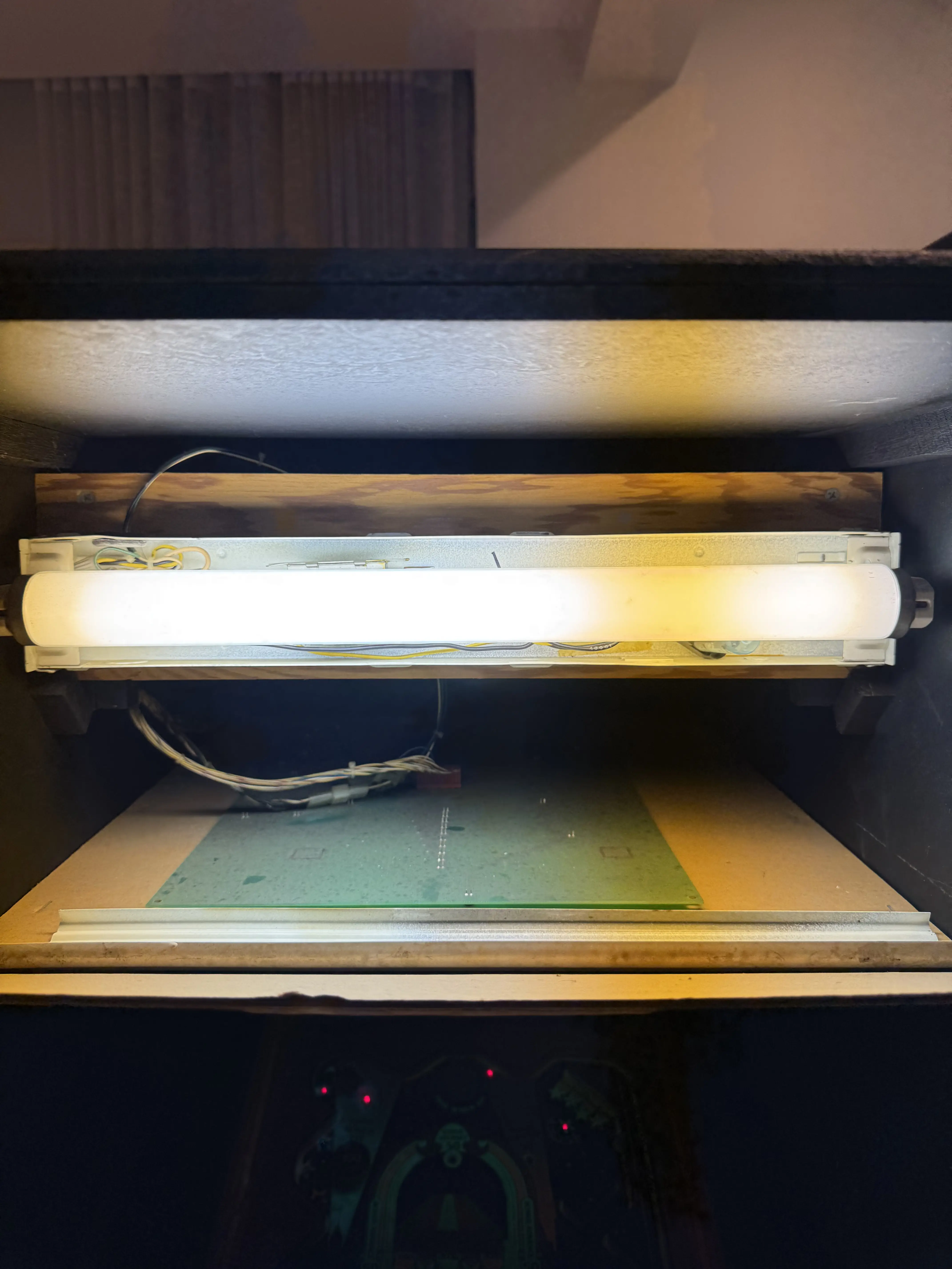 Com a retirada do marquee, foi possível ter acesso à luminária e também ao espelho que reflete o playfield do pinball, fixado no teto do teatro. Logo abaixo da luminária, fica a placa de LEDs que interagem com o jogo e também são refletidos no espelho. Havia bastante poeira nesta placa.