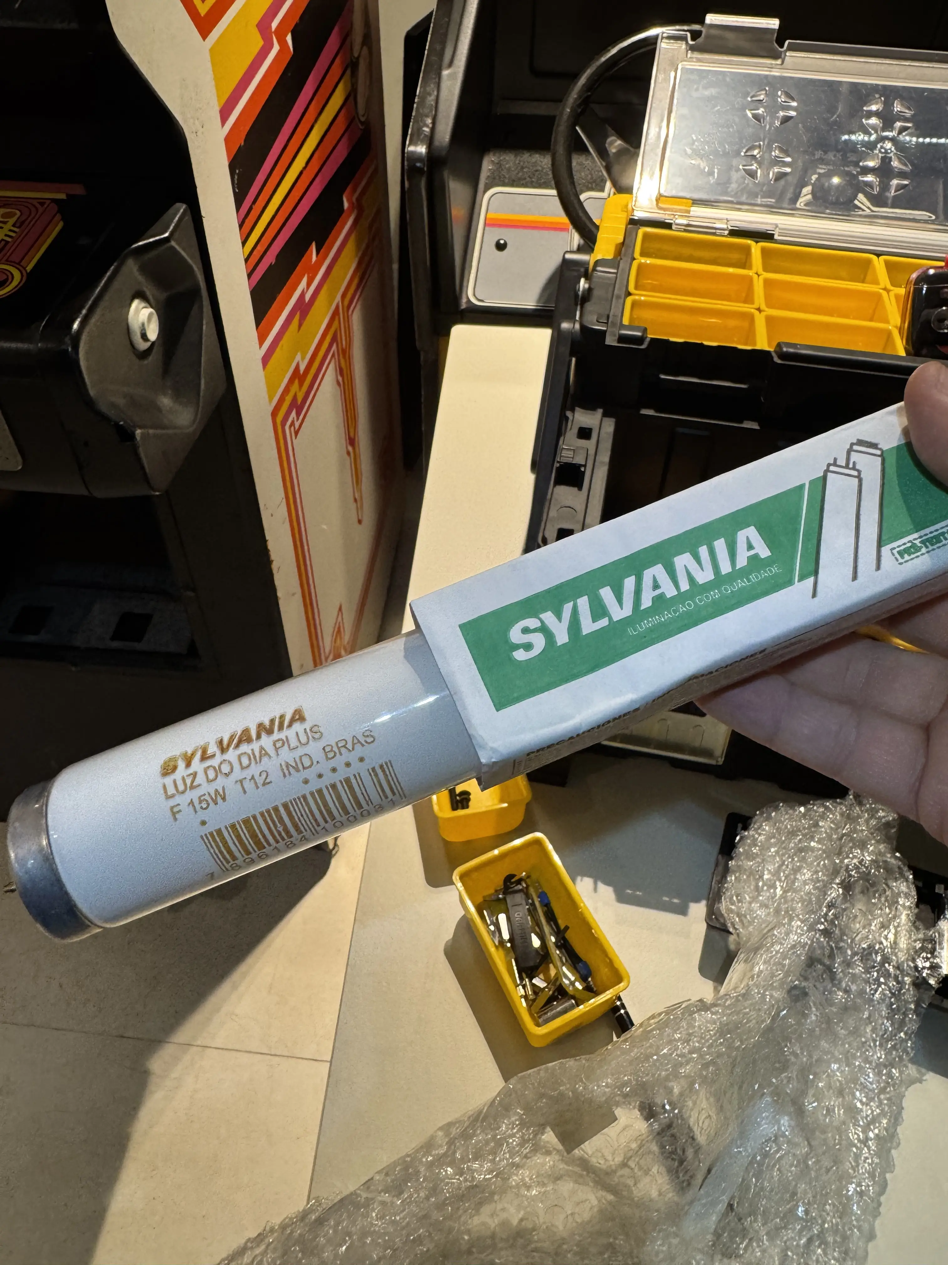 O diagnóstico? Mais uma peça estragada, como em todos os componentes principais deste gabinete. No caso, um simples starter, que costuma mesmo apresentar problemas com o tempo. Eu já tenho alguns de reserva no meu almoxarifado. Problema resolvido, marquee reestabelecido.
