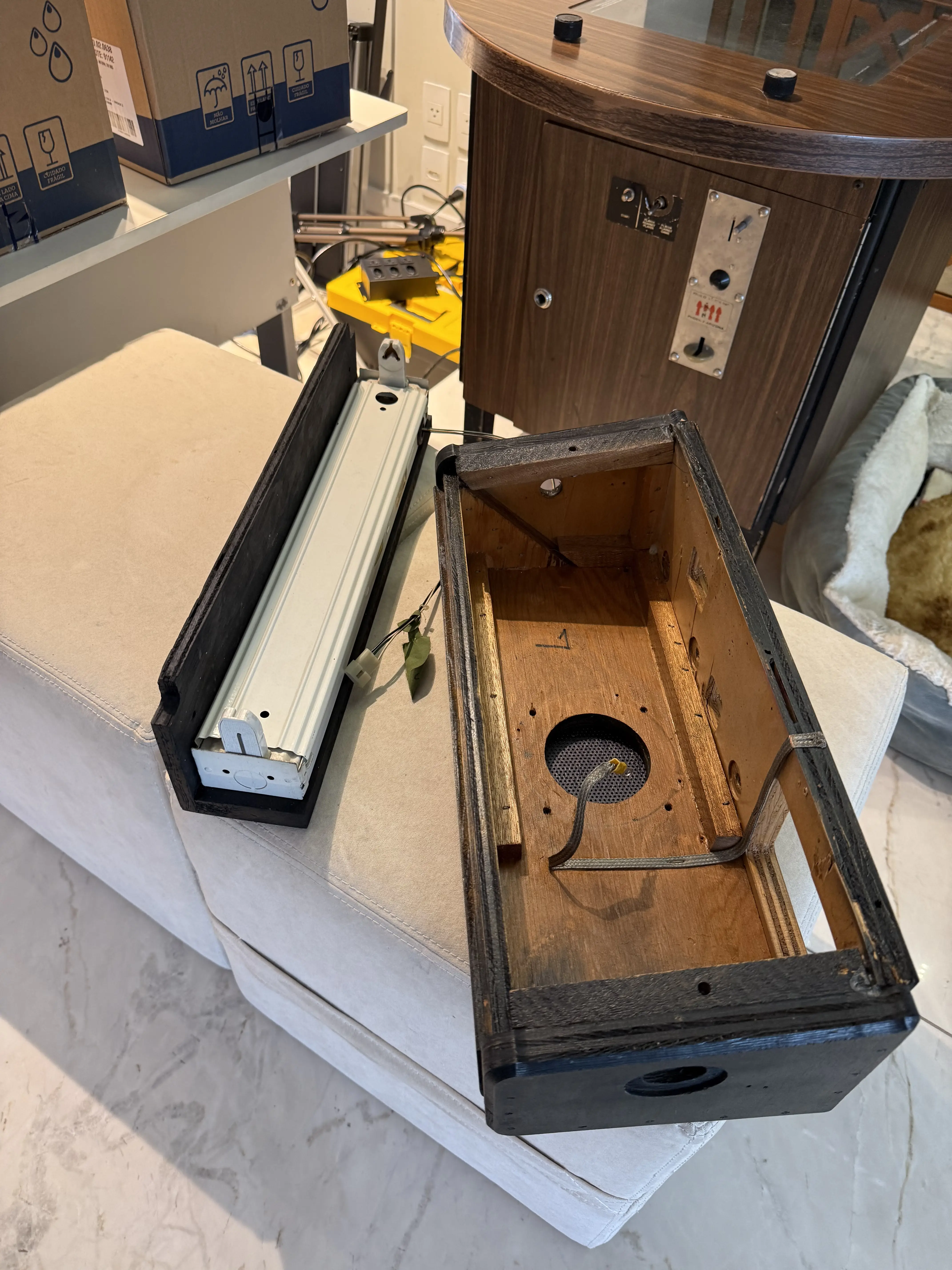 Além do trabalho feito no gabinete, o próprio painel de controle, fabricado em madeira, recebeu tratamento de verniz e restauração, bem como a luminária UV: