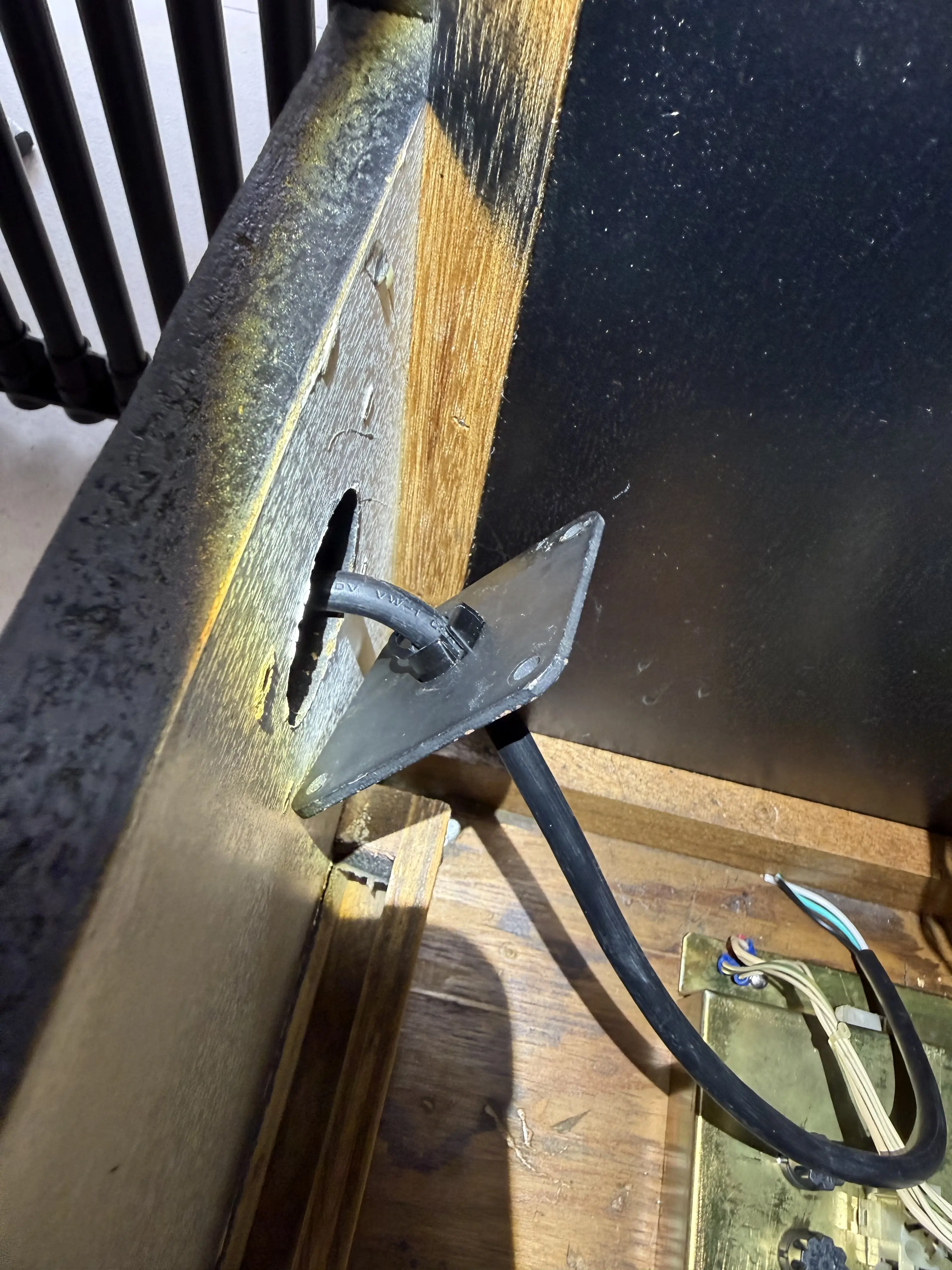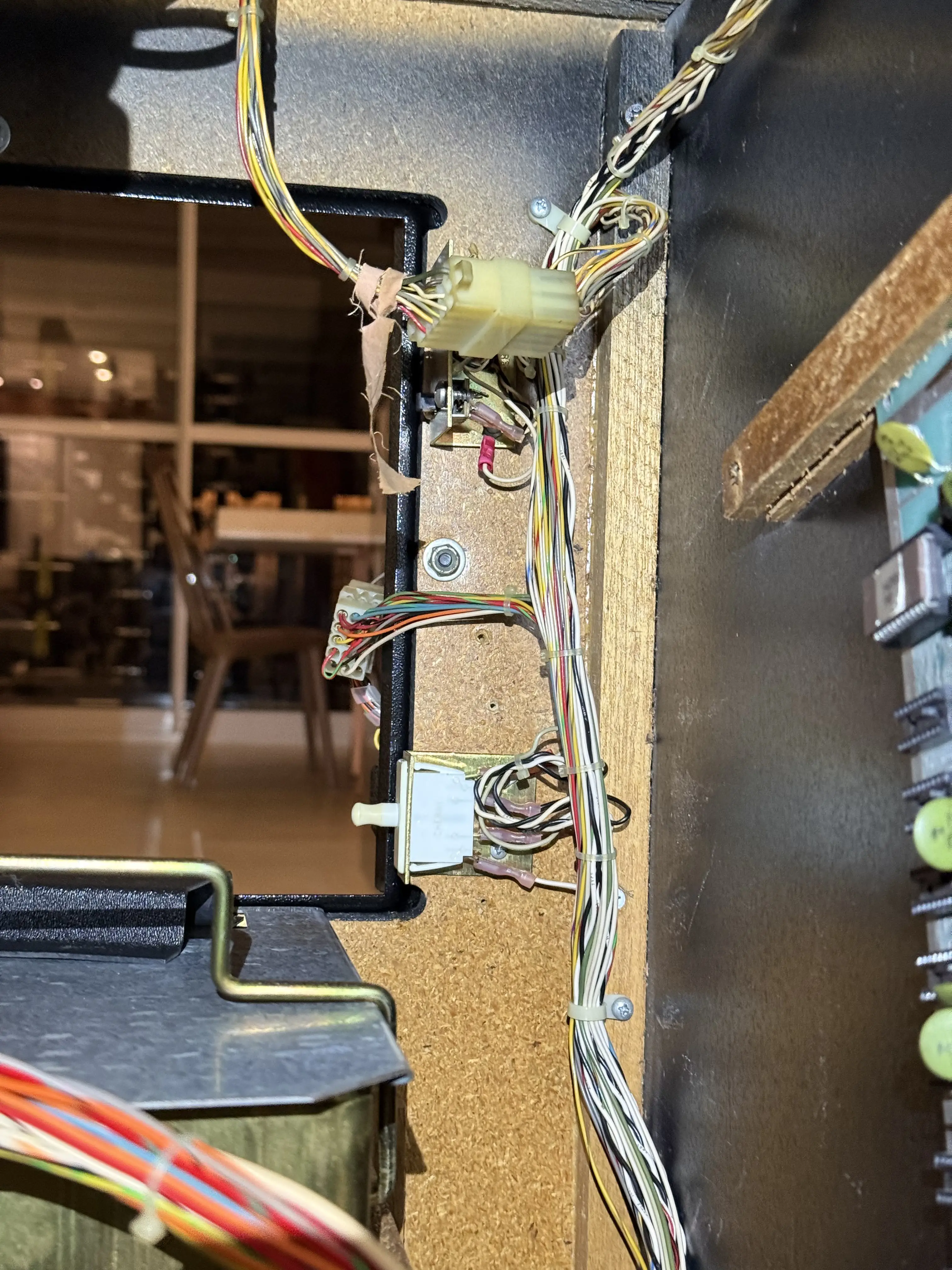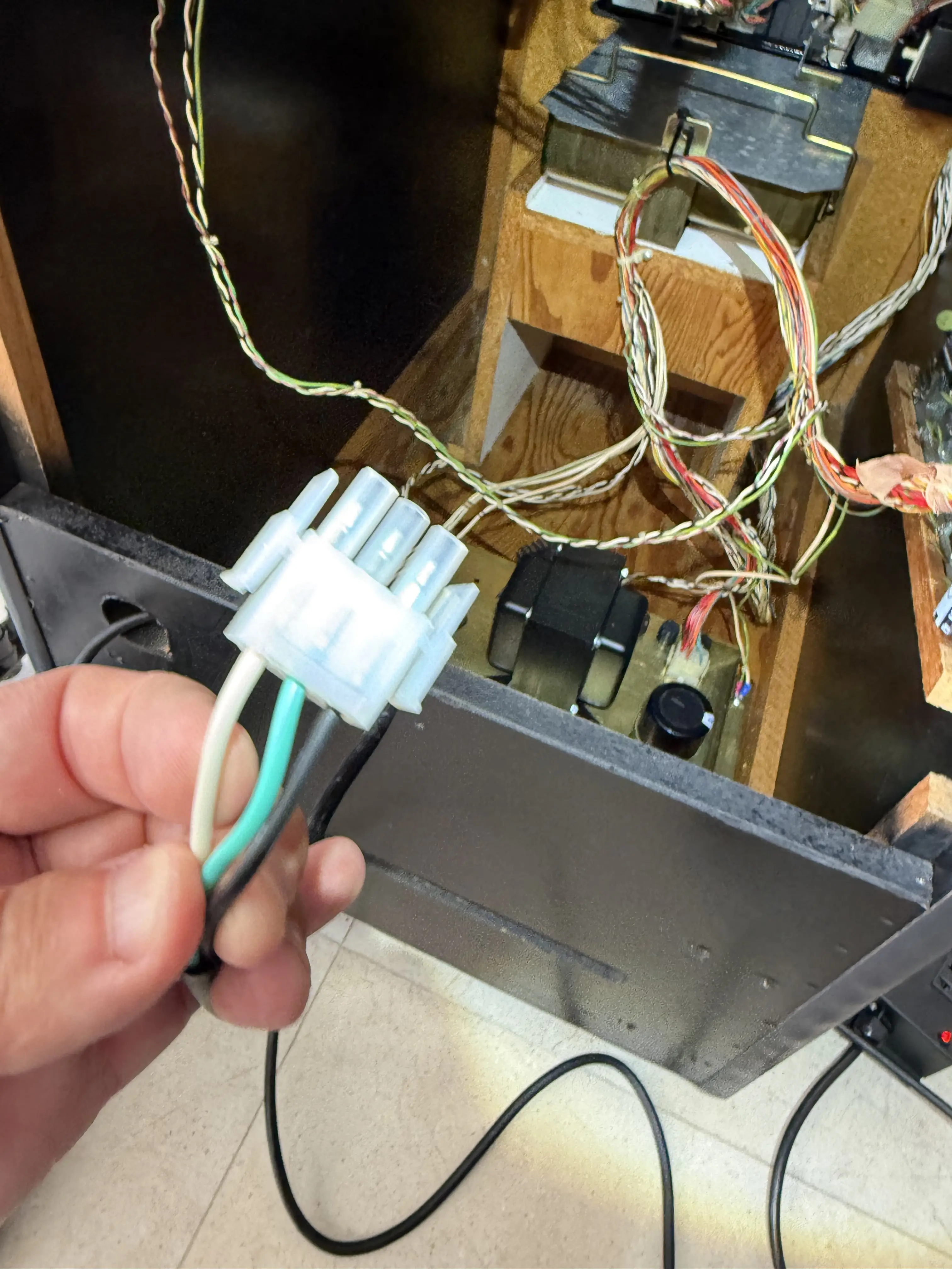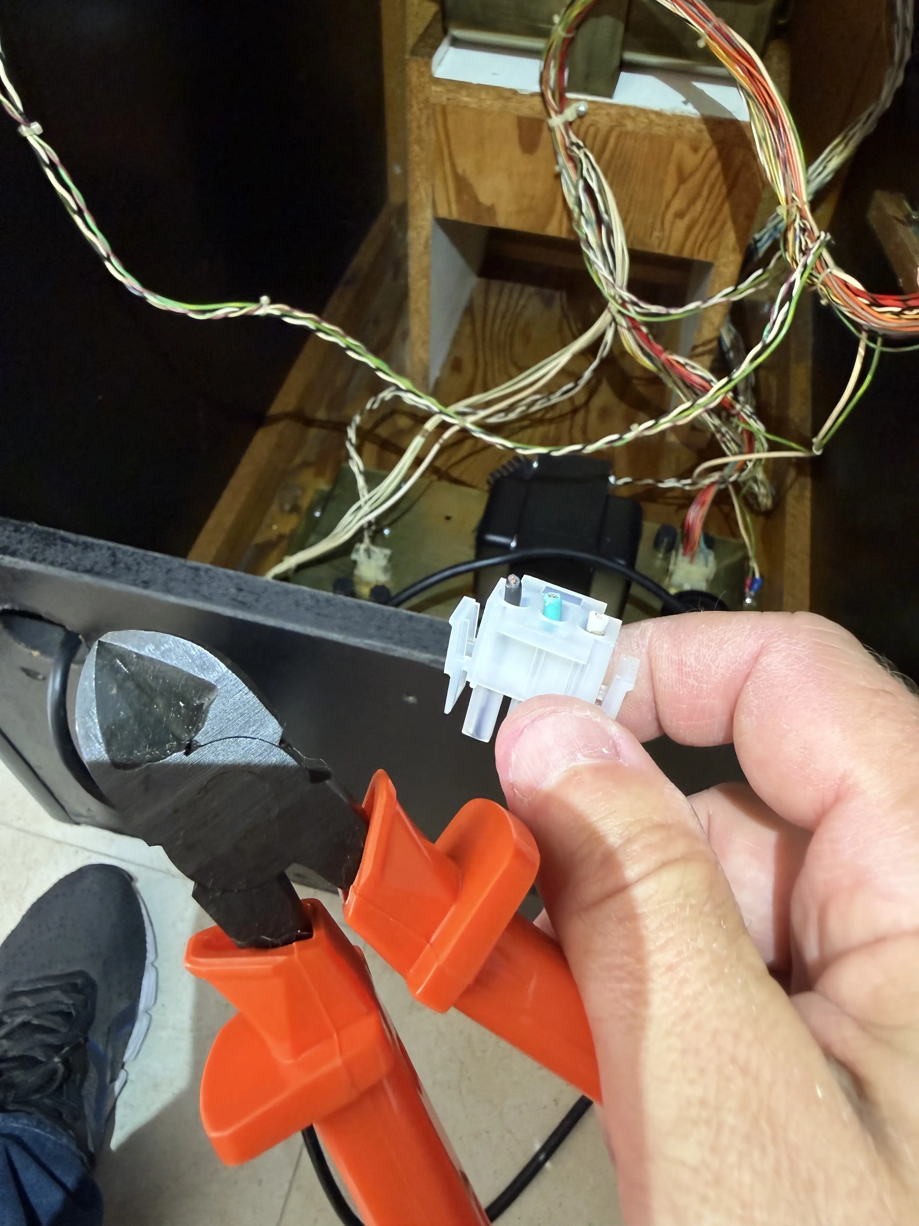 Por fim, eu havia me esquecido de instalar a chapa metálica do power cord, que serve para proteger o cabo de ser puxado excessivamente ao ligar o arcade a uma tomada. Infelizmente, isso exigiu que eu desmanchasse o plug original para a instalação de um novo conector. Eu não consegui retirar os pinos com o extrator Molex.
