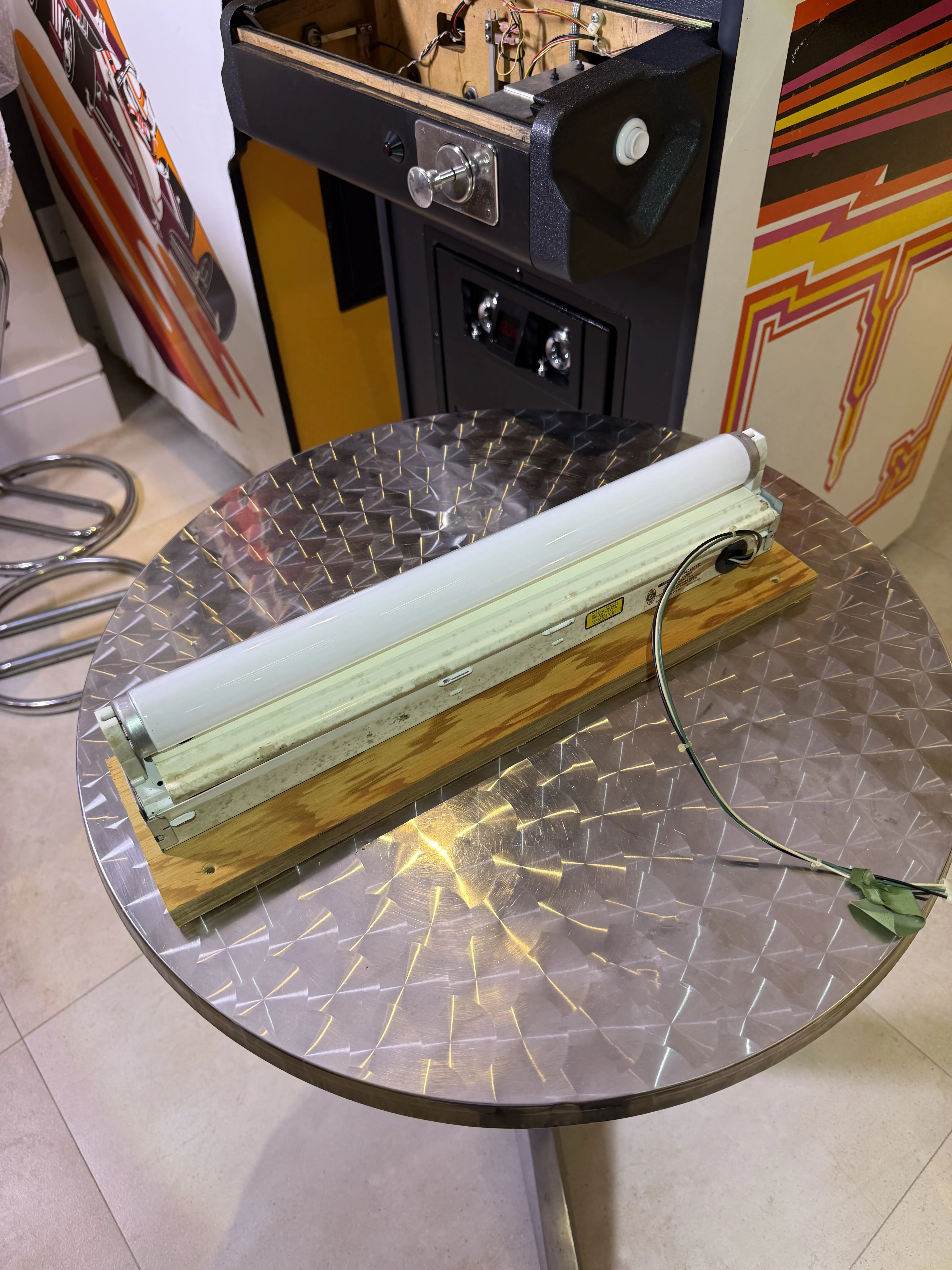 Antes de recolocar o marquee do arcade Video Pinball, da Atari, eu tive que consertar um defeito de mau contato na luminária frontal. Tem sido muito comum receber luminárias com as conexões internas soltas, causando falhas de liga e desliga na lâmpada.