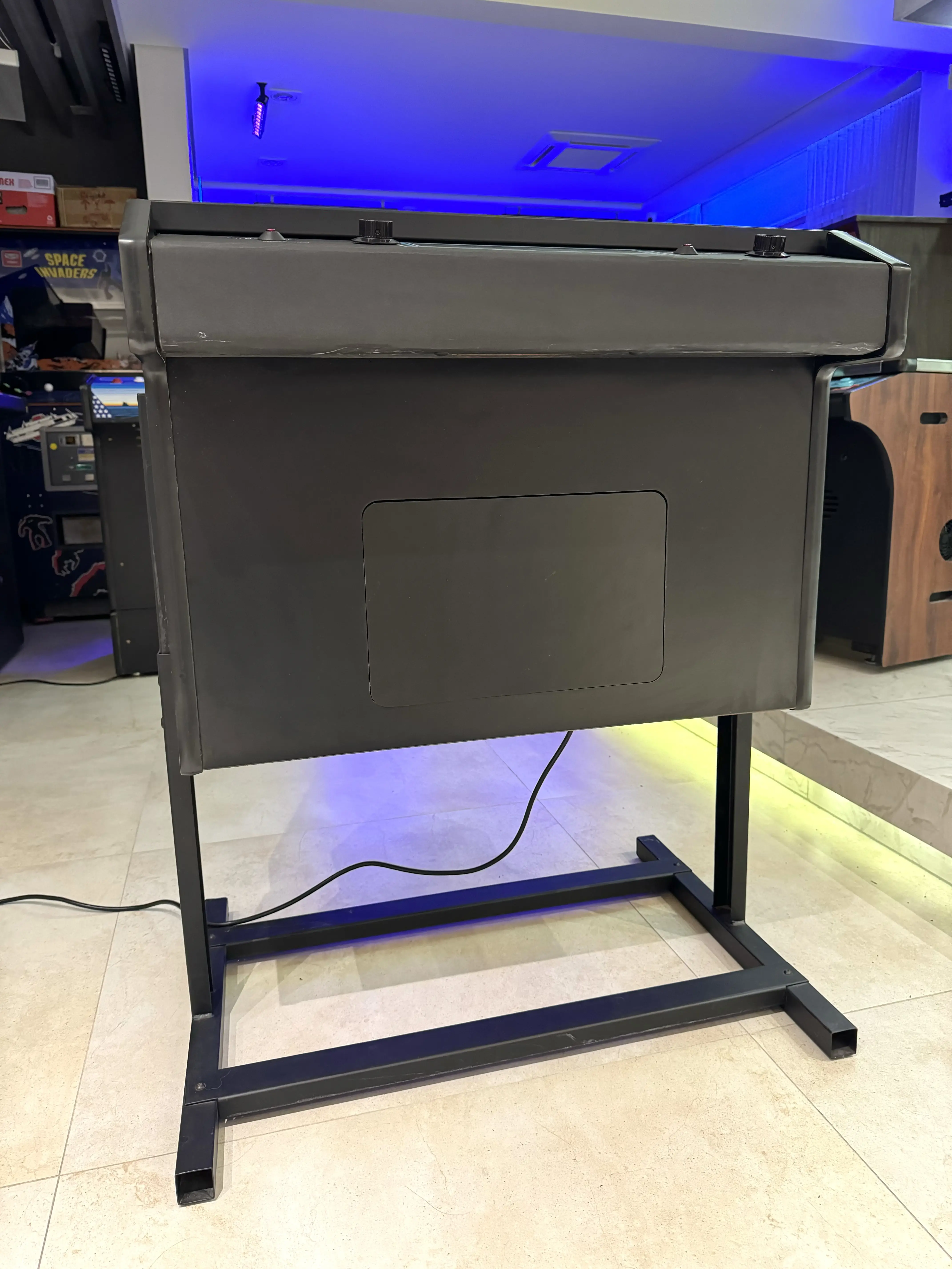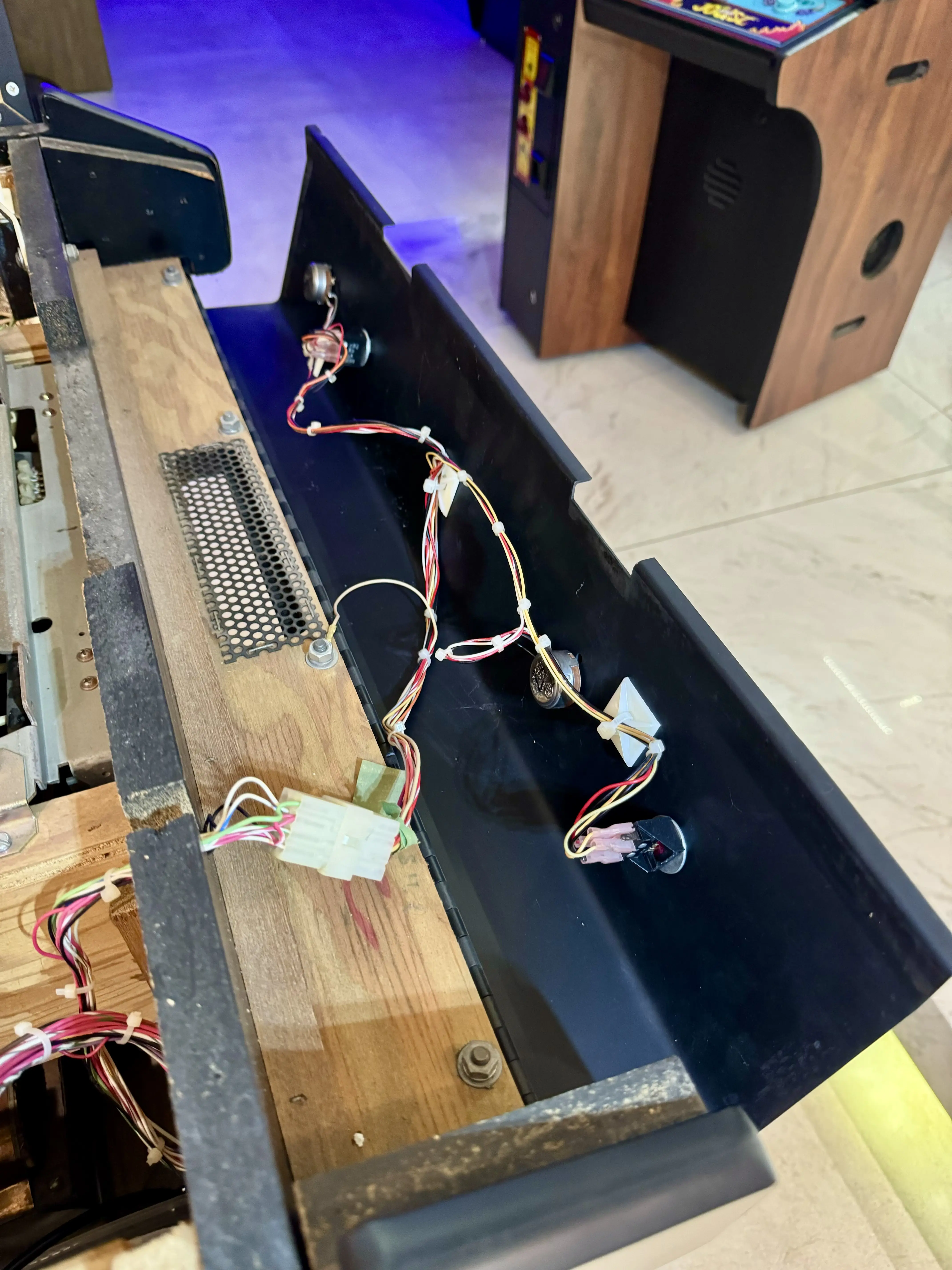O fundo do gabinete, uma das principais evidências do estado de conservação de um arcade, está mantido na sua originalidade, sem empenamento ou umidade: