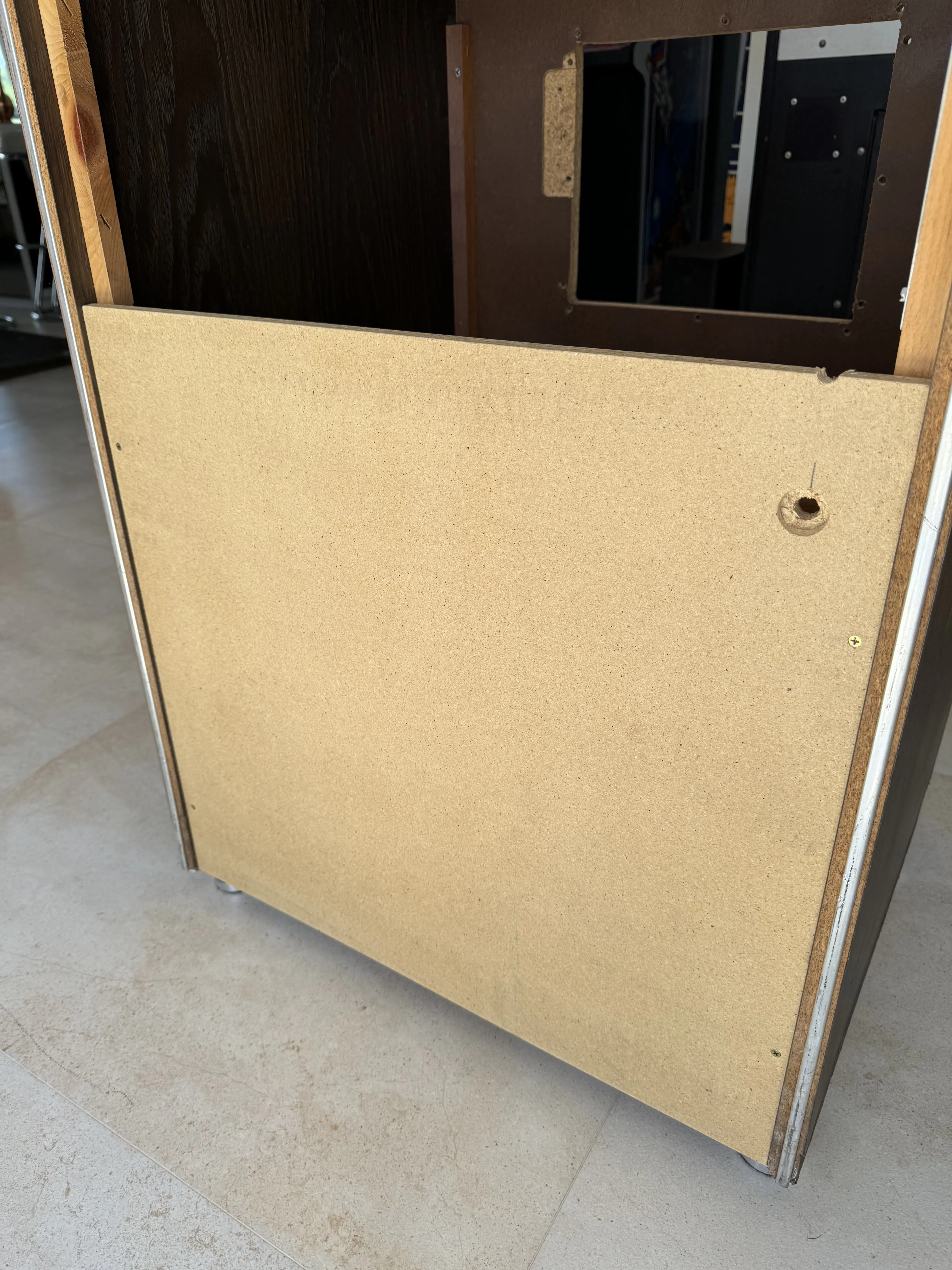 Um trabalho impecável foi realizado na restauração da parte inclinada do gabinete, onde se alojam os pés do jogador. Pelas fotos, é possível perceber a utilização de madeira laminada com o desenho praticamente idêntico ao original – a sutil diferença de tonalidade é quase imperceptível.